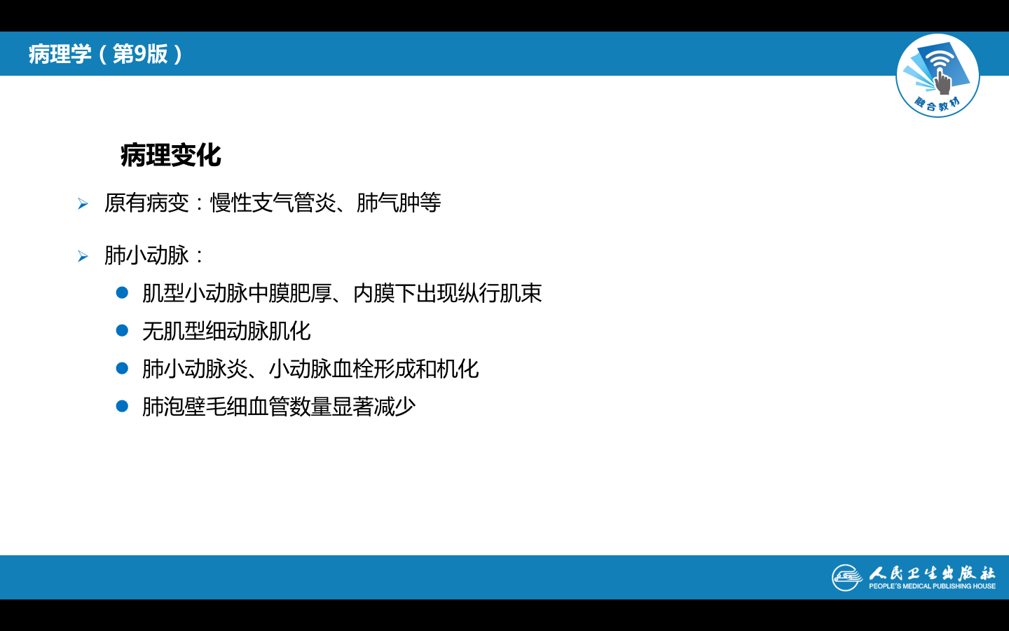 1.肺部病变 肺内除原有肺部疾病如慢性支气管炎、肺气肿、肺结核、尘肺等病变外,其主要病变是肺小动脉的改变。表现为肌型小动脉中膜平滑肌细胞增生、细胞外基质增多,内皮细胞增生肥大,内膜下出现纵行肌束,使血管壁增厚,管腔狭窄。无肌型细动脉出现中膜肌层和内、外弹力层,即发生无肌细动脉肌化。还可发生肺小动脉炎及小动脉血栓形成与机化。肺泡壁毛细血管数量显著减少。