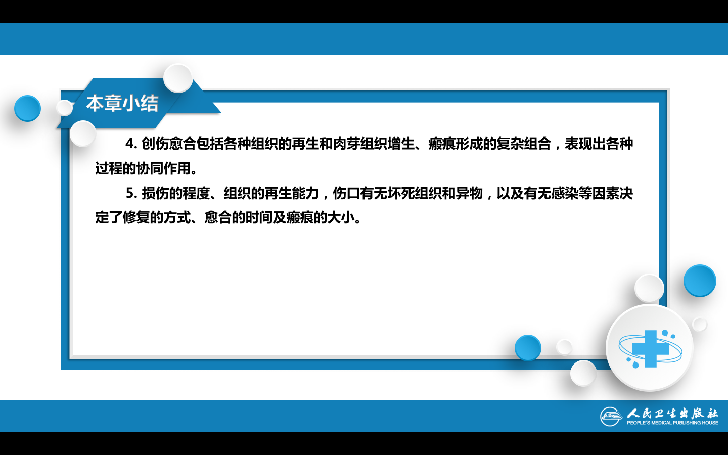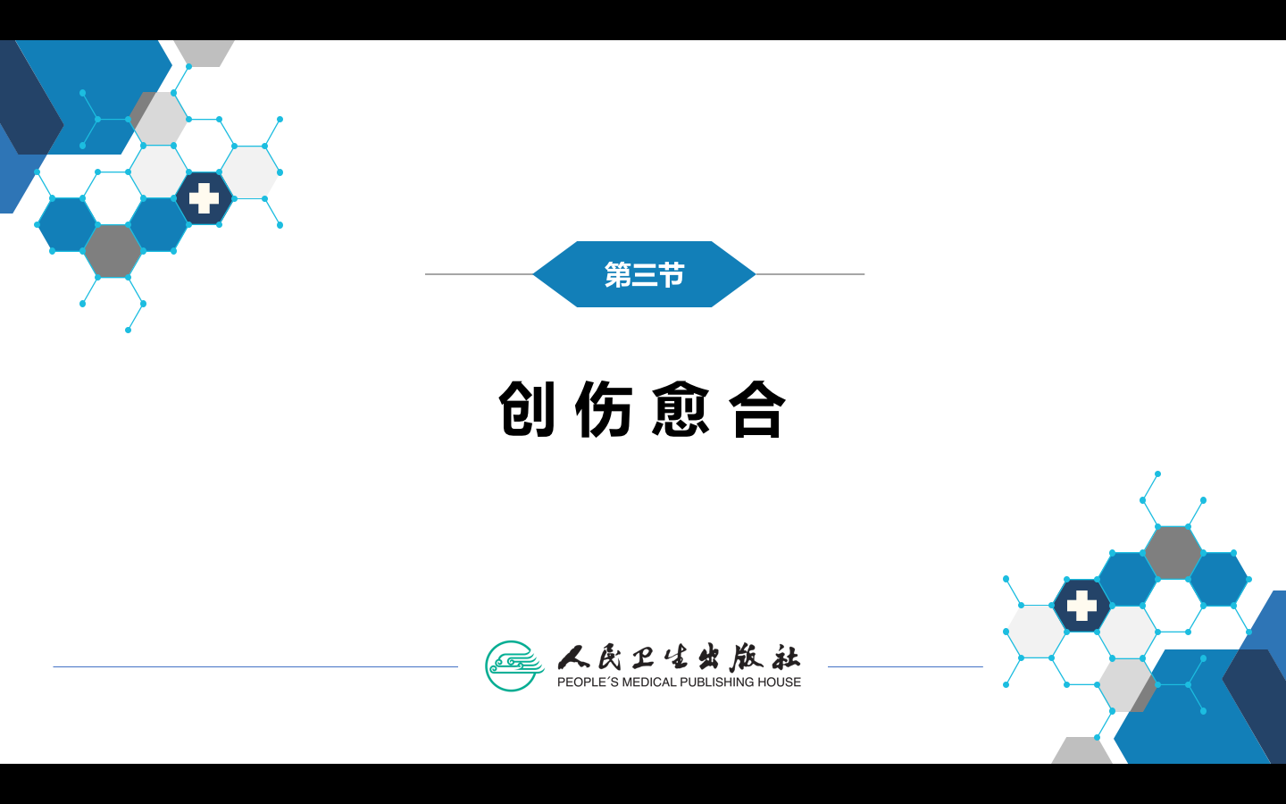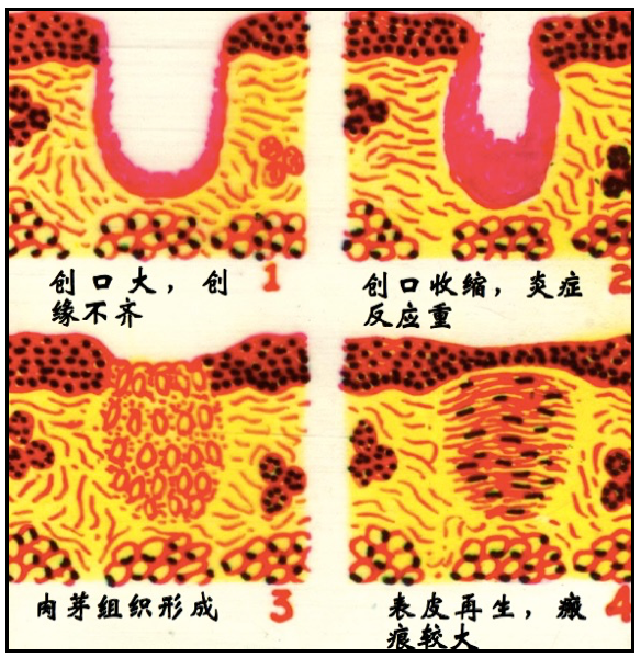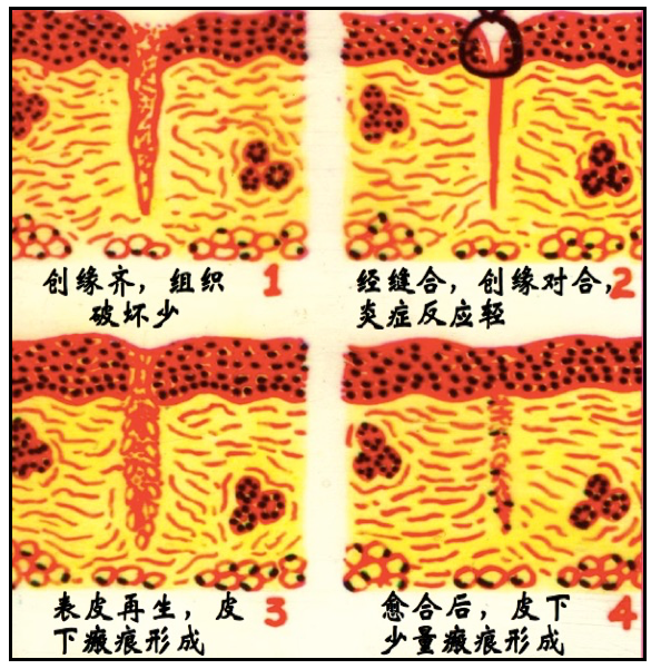 创伤愈合(wound healing)是指机体遭受外力作用,皮肤等组织出现离断或缺损后的愈复过程,包括了各种组织的再生和肉芽组织增生、瘢痕形成的复杂组合,表现出各种修复过程的协同作用。