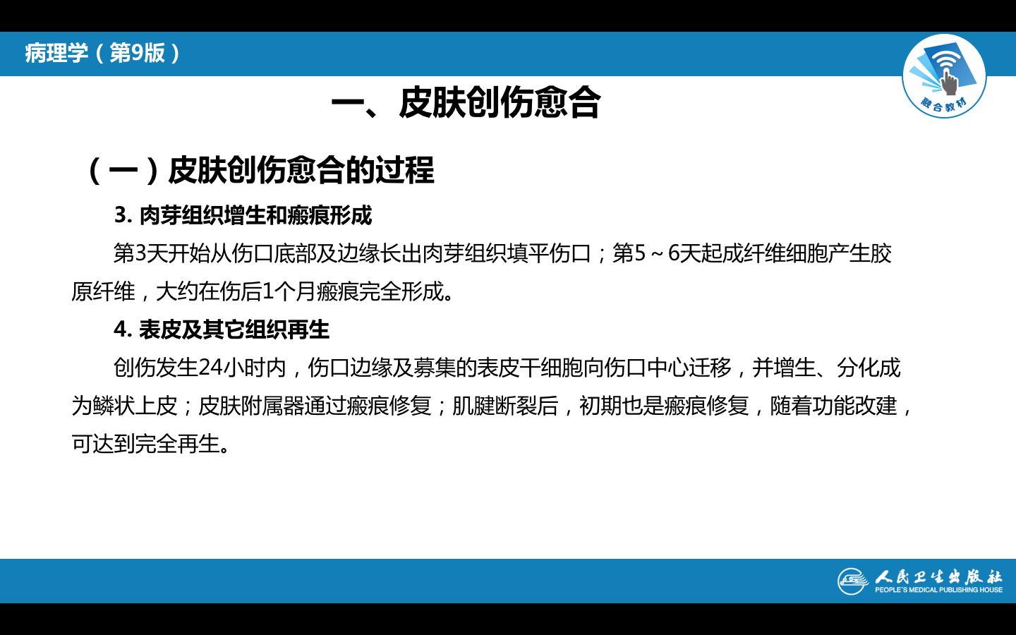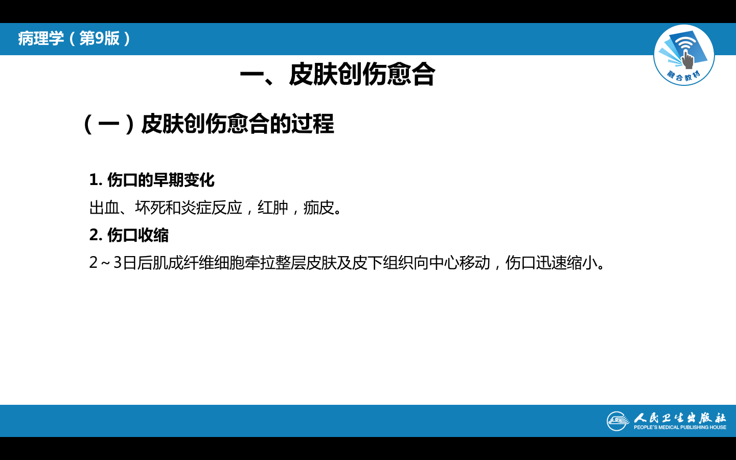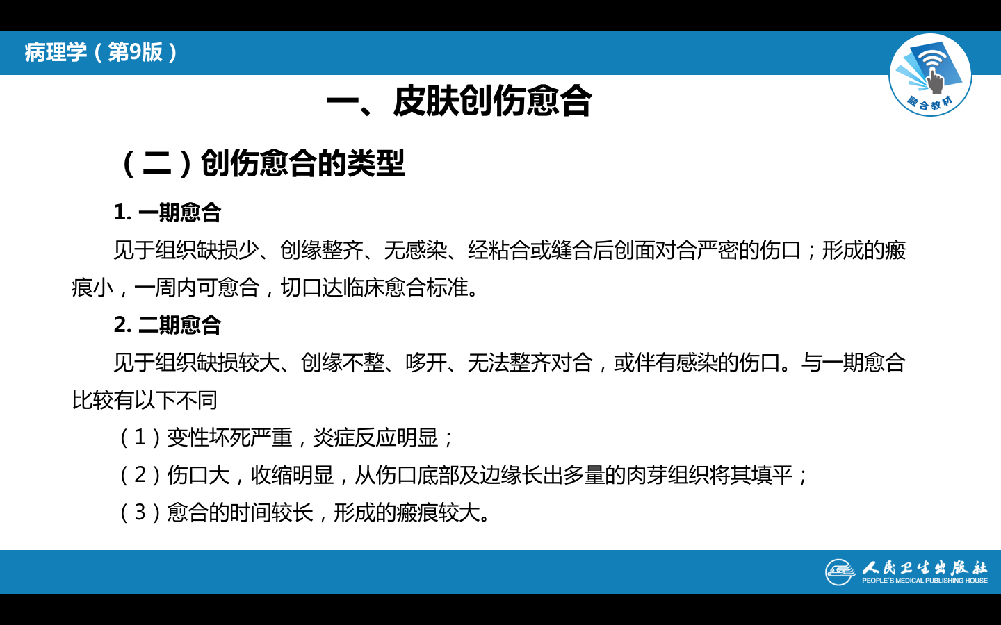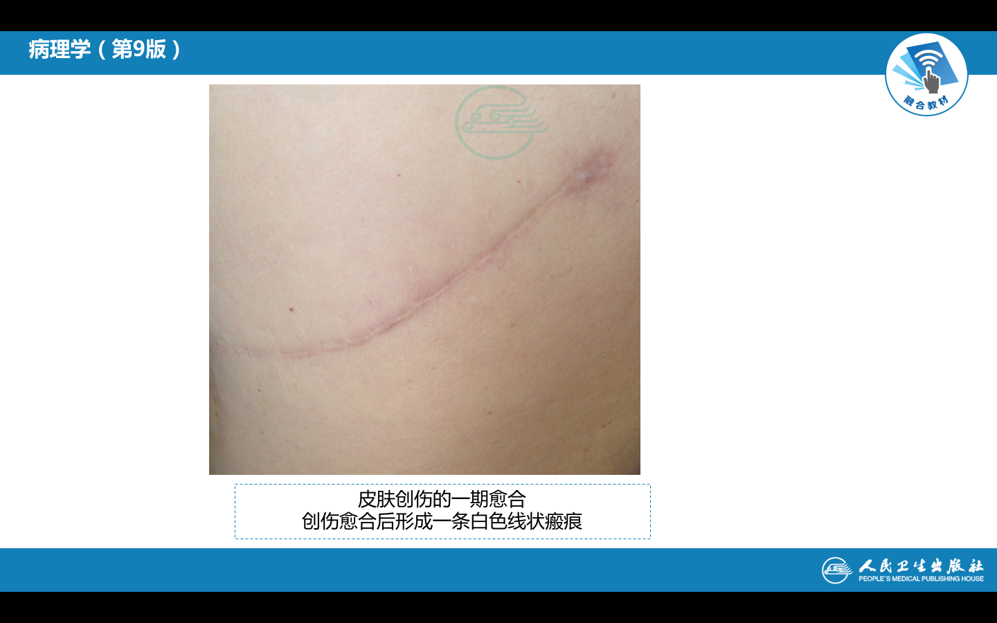 一期愈合(primary healing)见于组织缺损少、创缘整齐、无感染、经粘合或缝合后创面对合严密的伤口,例如手术切口。这种伤口中只有少量血凝块,炎症反应轻微,表皮再生在1~2天内便可完成。肉芽组织在第2天就可从伤口边缘长出并很快将伤口填满,5~6天胶原纤维形成(此时可以拆线),约2~3周完全愈合,留下一条线状瘢痕。一期愈合的时间短,形成瘢痕少,抗拉力强度大。