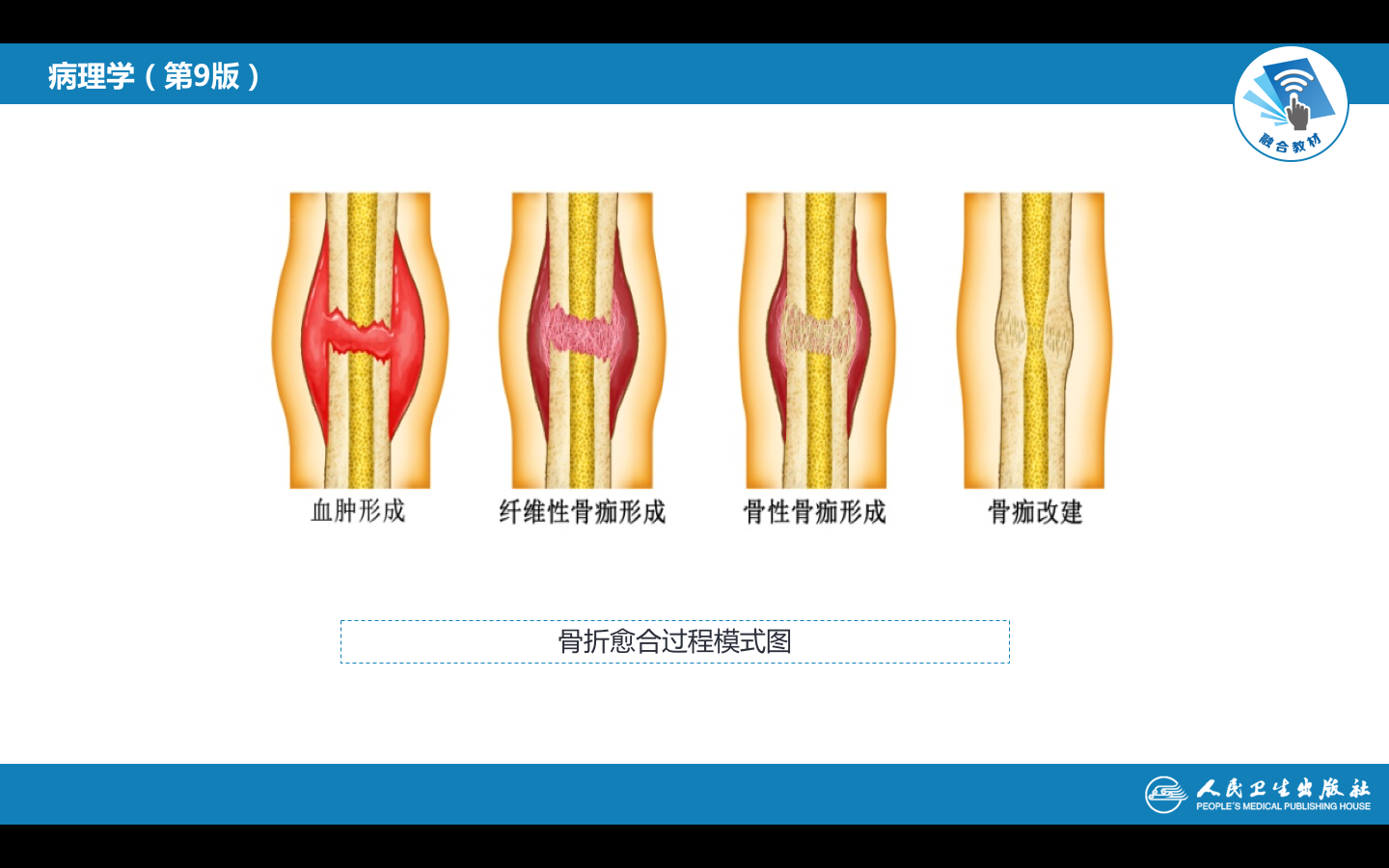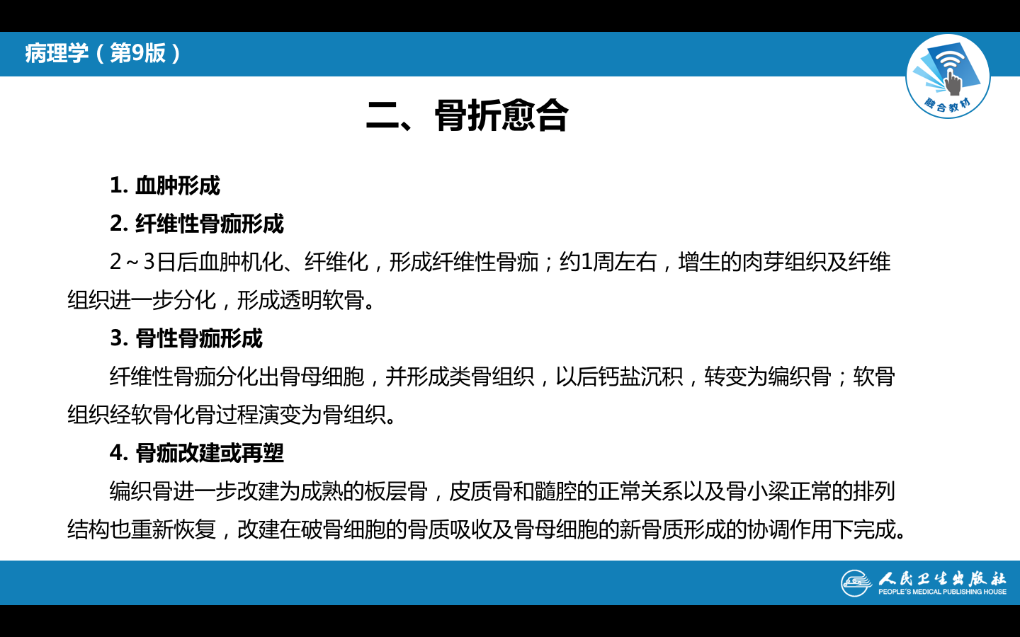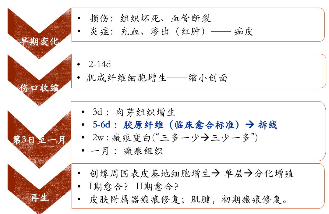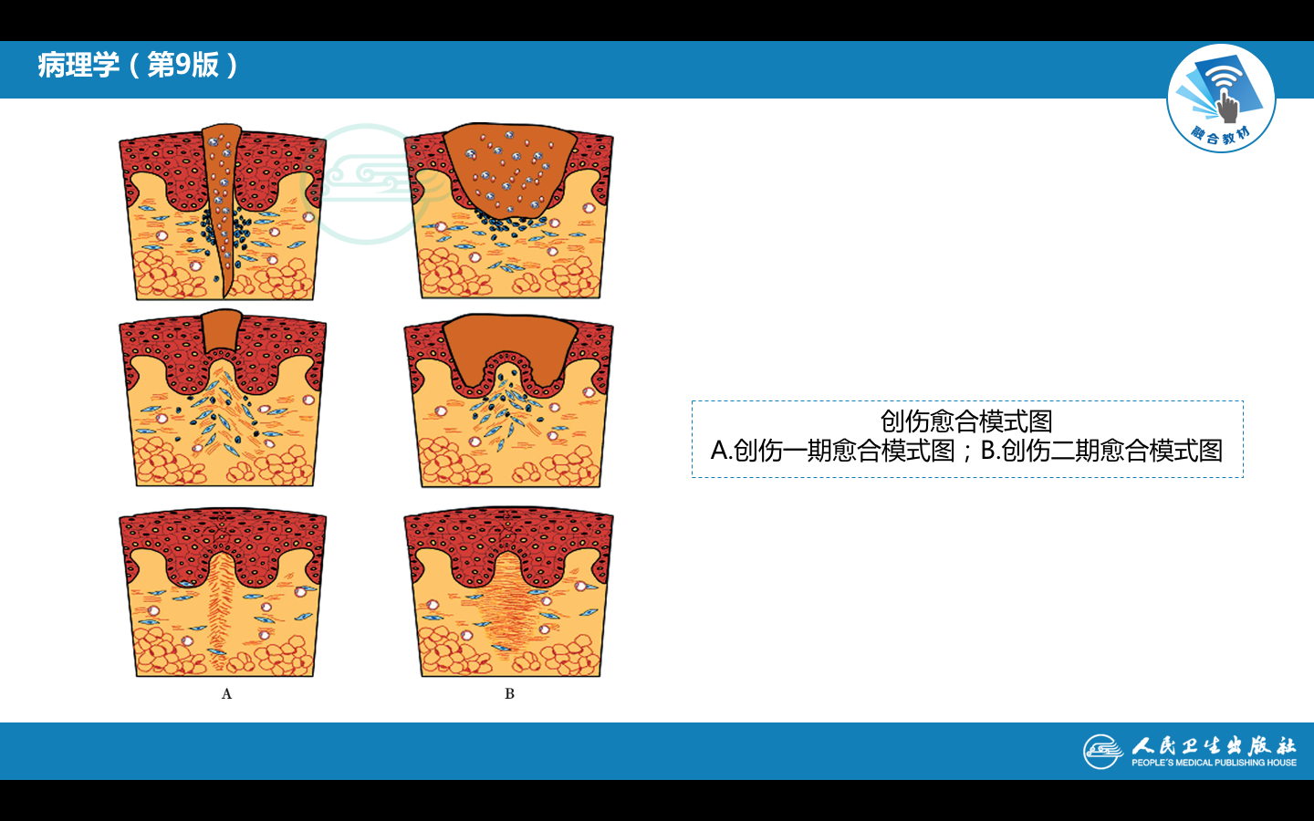 一期愈合(primary healing)见于组织缺损少、创缘整齐、无感染、经粘合或缝合后创面对合严密的伤口,例如手术切口。这种伤口中只有少量血凝块,炎症反应轻微,表皮再生在1~2天内便可完成。肉芽组织在第2天就可从伤口边缘长出并很快将伤口填满,5~6天胶原纤维形成(此时可以拆线),约2~3周完全愈合,留下一条线状瘢痕。一期愈合的时间短,形成瘢痕少,抗拉力强度大。
