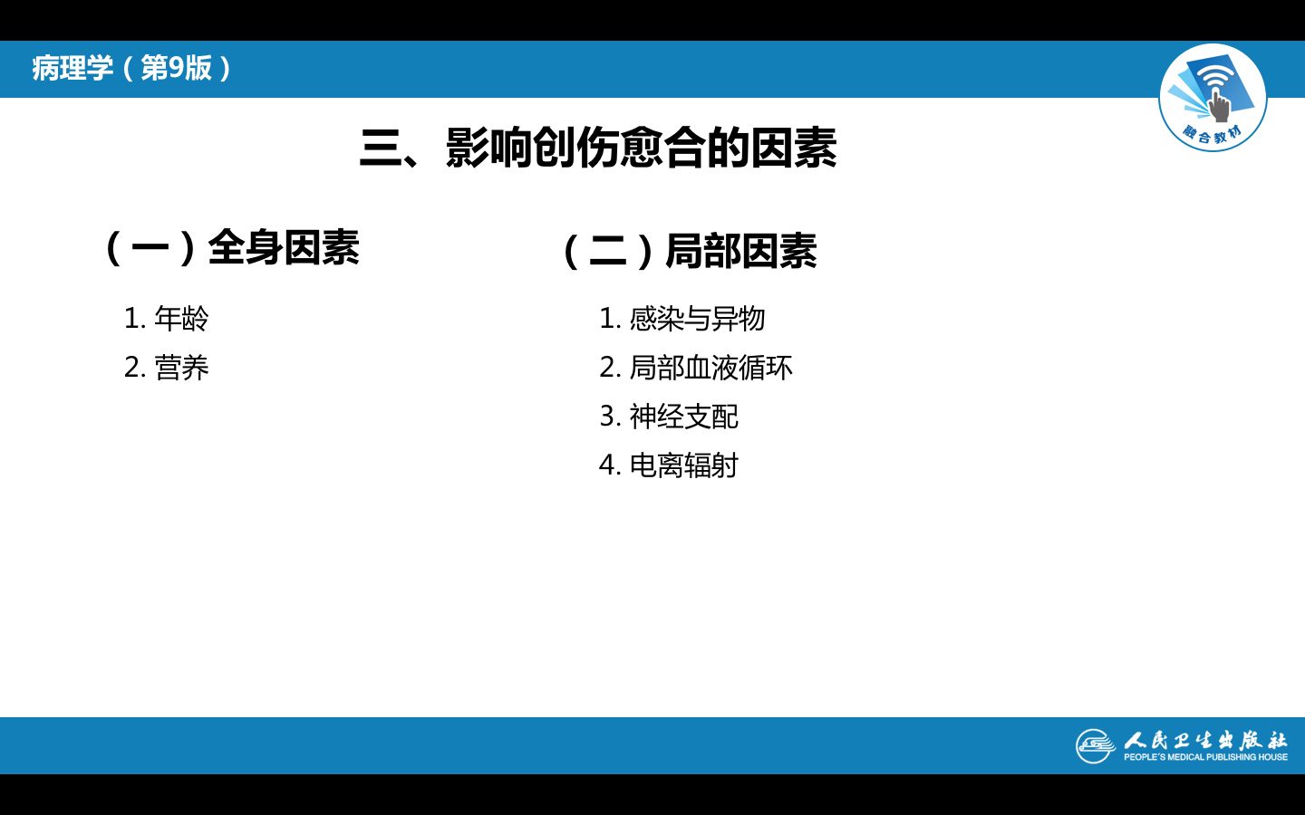 1.年龄因素 :儿童和青少年的组织再生能力较强,创伤愈合快。老年人则相反,组织再生力差,愈合慢,这与老年人血管硬化、血液供应减少有很大的关系。