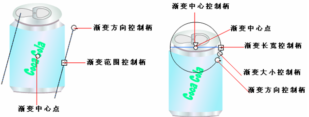2、“渐变变形工具”的使用:用来调整渐变色填充和位图填充,下图为线性填充和放射性填充的变形控制柄和中心点。