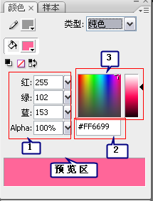 使用“颜色”面板来设置填充的纯色时,又有三种方法:①是通过输入RGB的值及透明度来选择具体颜色;②是通过输入十六进制数来选择颜色;③是先选择色块,再选择明暗度来设置颜色。
