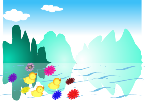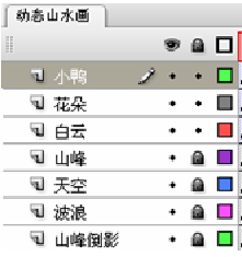 7、调整各图层的关系如下图,并在“白云”、“小鸭”和“花朵”图层设置补间动画,并调整“花朵”图层每片花朵的透明度。