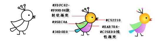 5、绘制“小鸟”元件,并进行颜色填充,过程如下图: