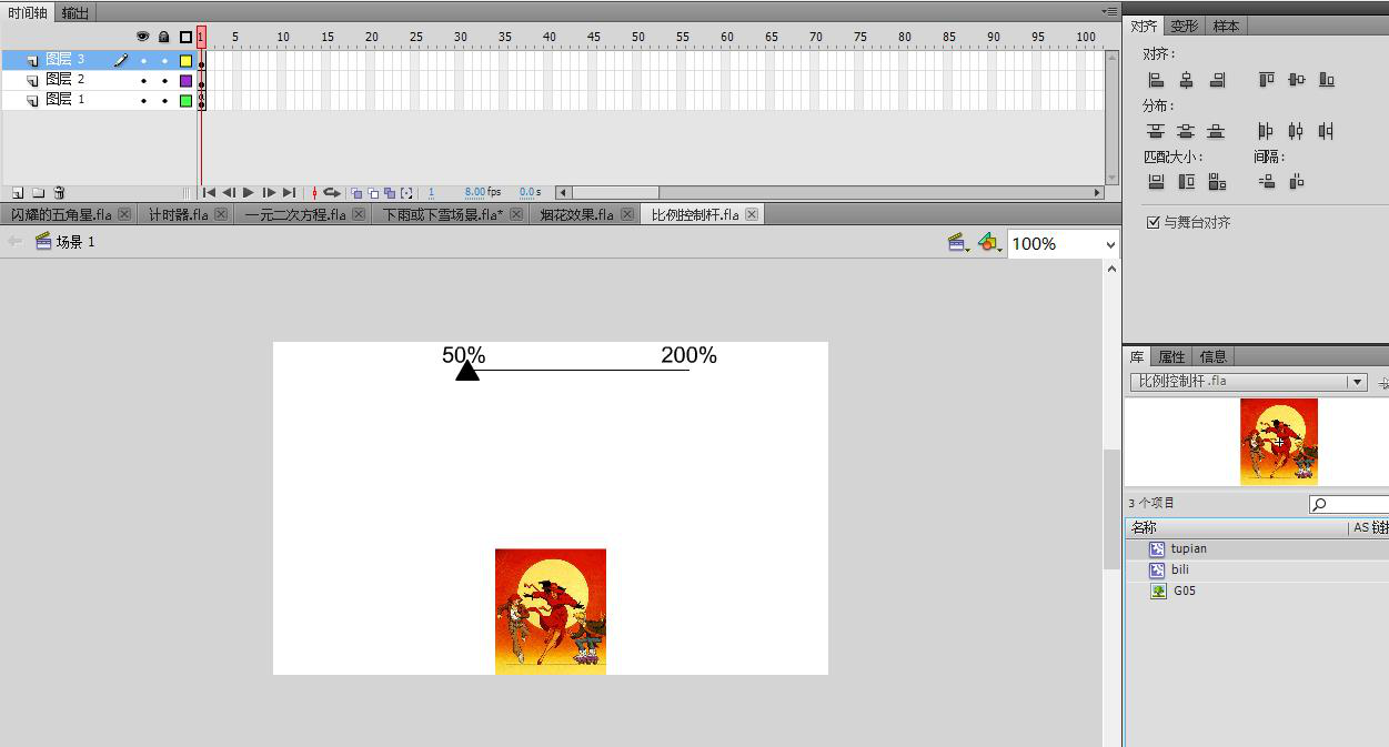 (1)新建文档,从场景(175,25)点向右绘制一条200点的水平线,并分别在头和尾添加静态文本50%、200%;
