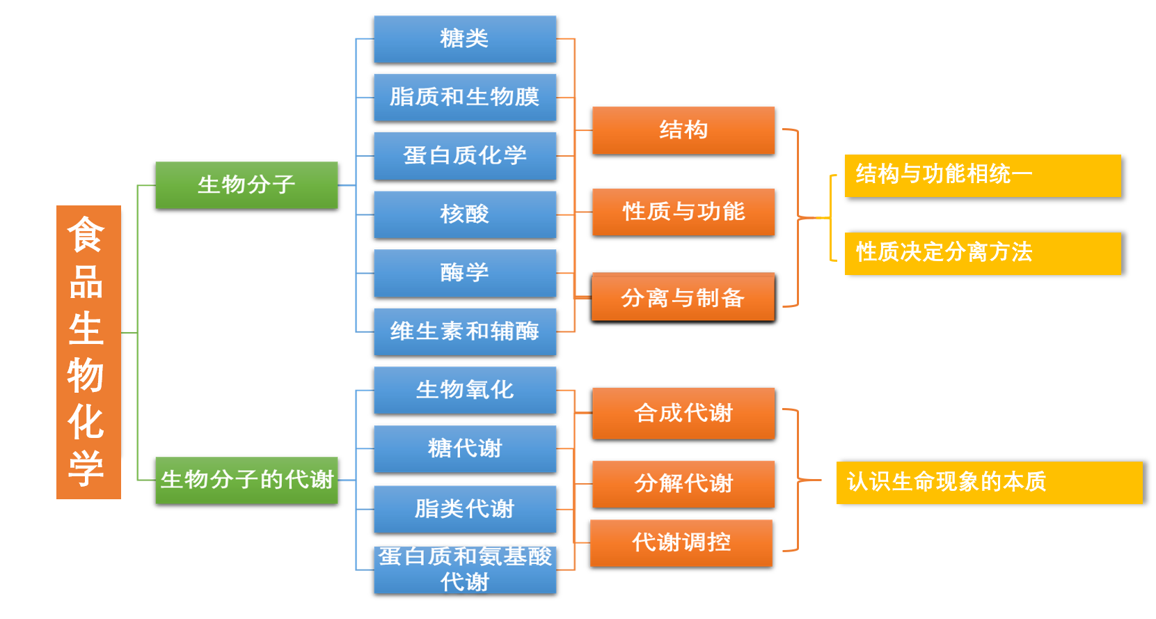 食品生物化学教学内容主要包括三部分内容:1. 生物体的物质分子组成与结构;2. 物质代谢与调控;3. 遗传信息传递的分子基础与调控规律。本课程重点学习前两部分内容,第三部分不做要求。