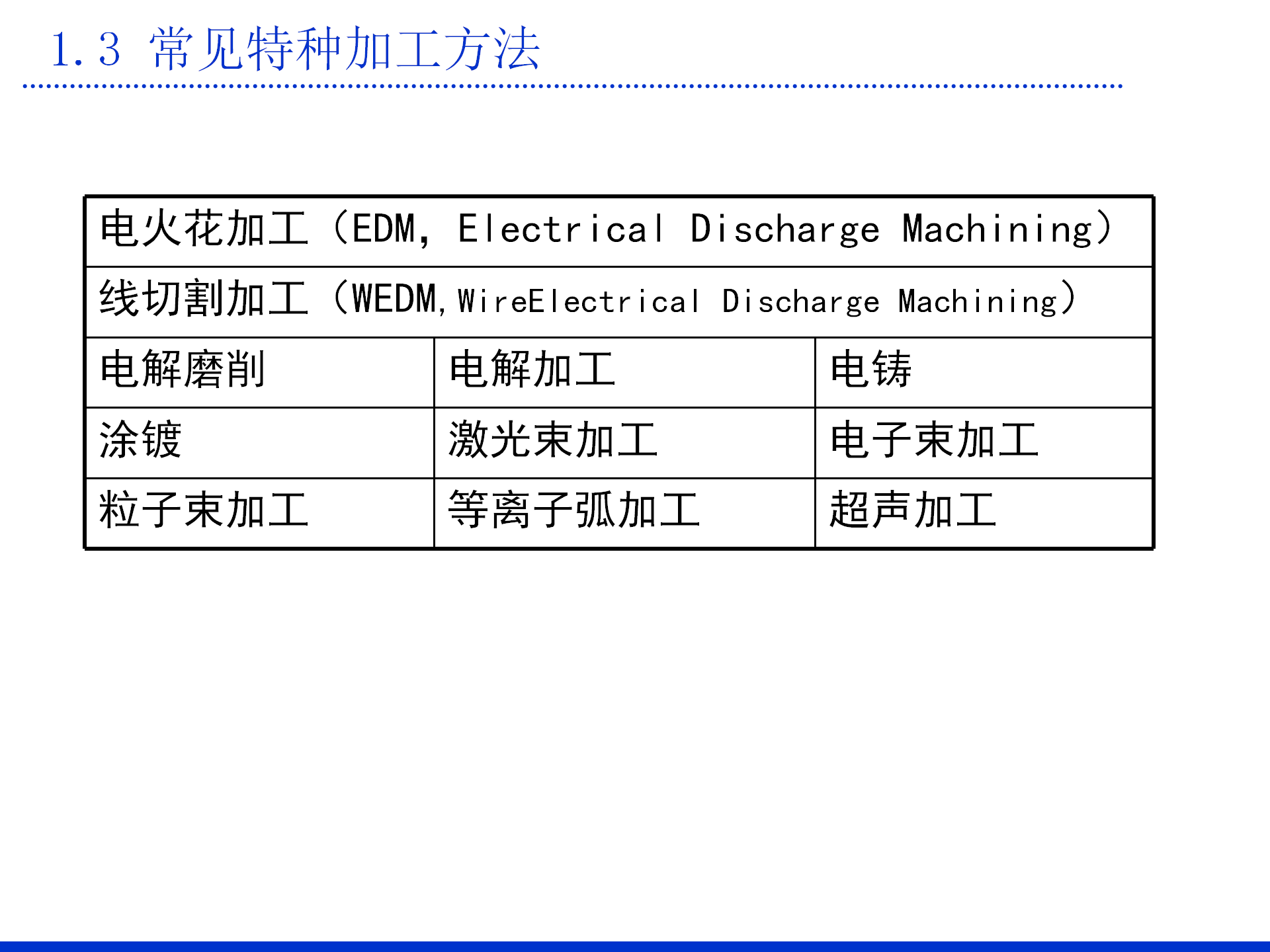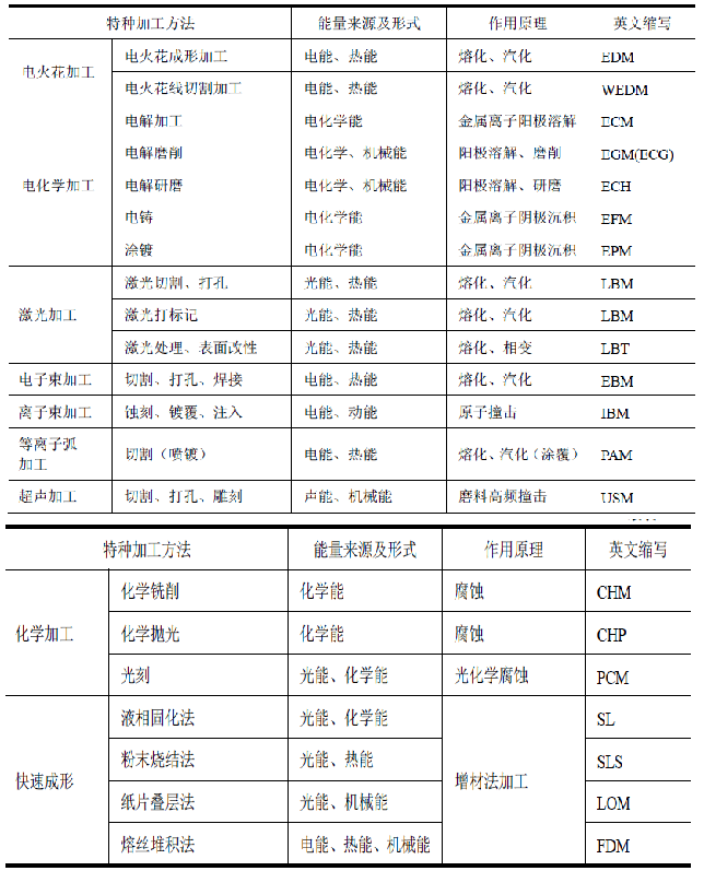 特种加工目前还没有明确的分类,一般按能量来源及形式,以及作用原理进行划分,常用的特种加工方法分类见表1-1。