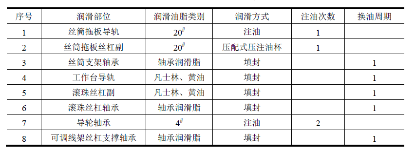 线切割机床结构简单,运动速度较低,无须设置专门的自动润滑系统,只需定期进行人工润滑即可,详见表3-4。