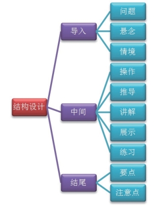 如图4-17所示,微课程的内容大致分为三段,即导入、中间和结尾。导入时,可以采用提问、引起悬念、创设情境等方式。中间可以展示操作过程、推导方法、讲解步骤、展示效果、练习巩固等内容。结尾需要进行要点梳理、注意点提醒等。