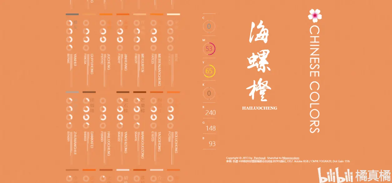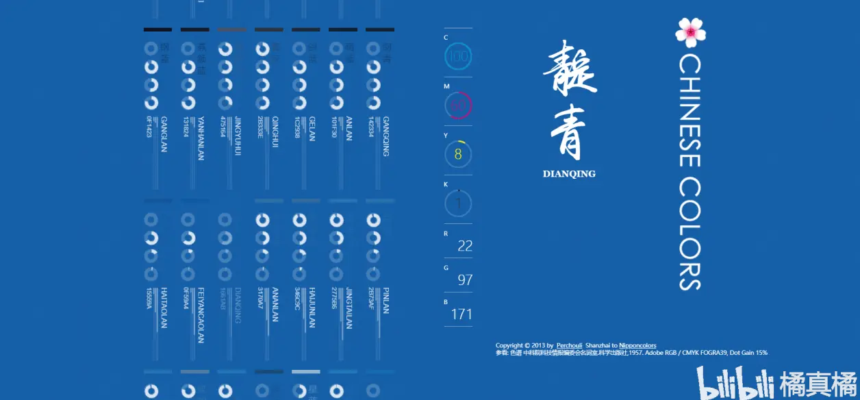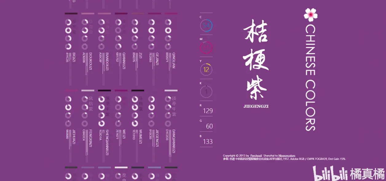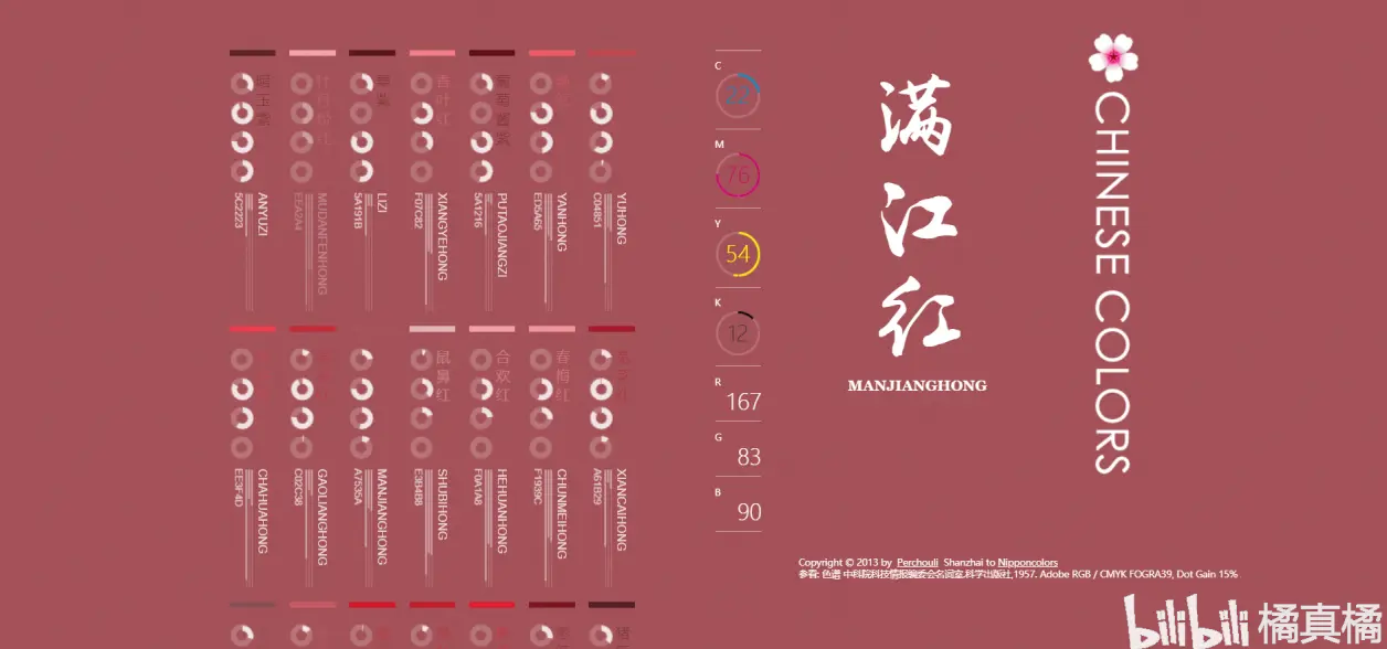提供各种中国的传统颜色的名称,CMYK值,RGB值,16进制表示。