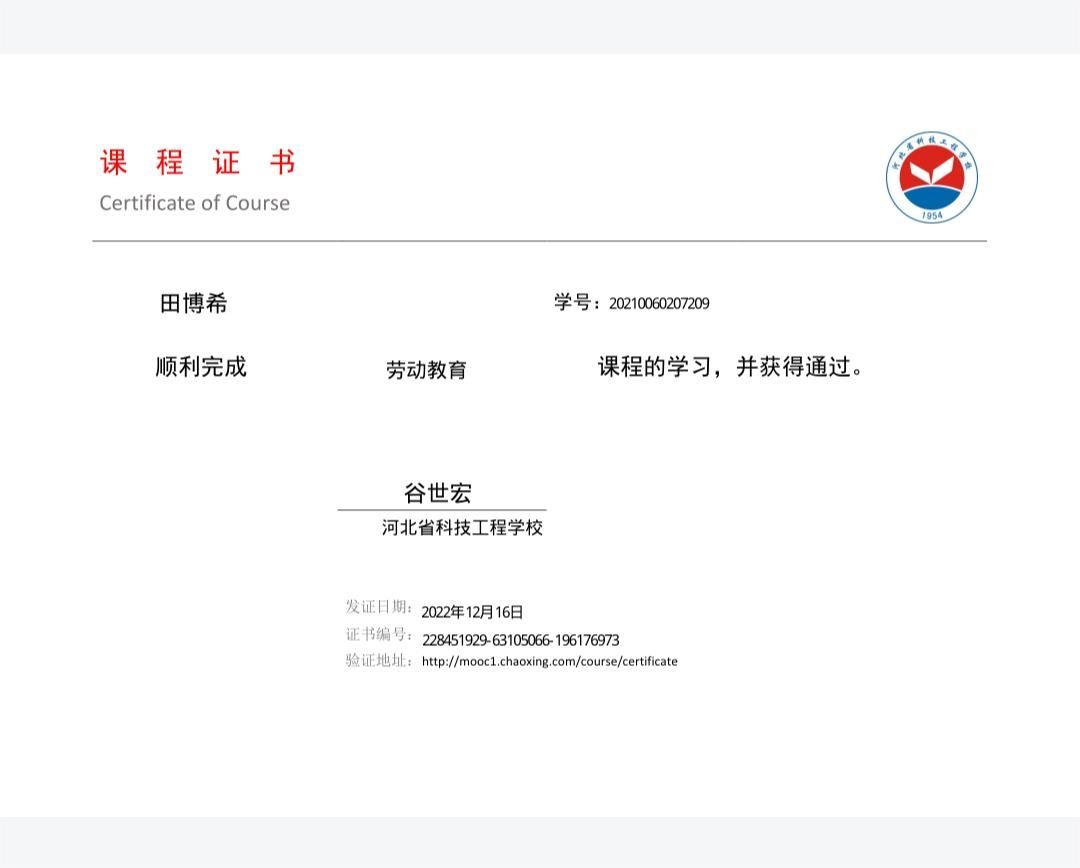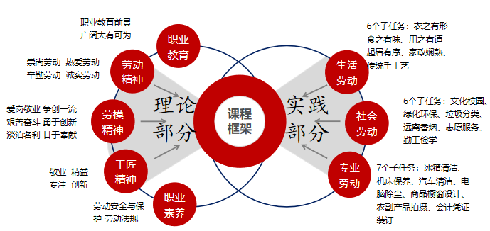 本课程共计36学时,2课时/周。内容分为理论篇与实践篇,理论篇包涵劳动精神、劳模精神、工匠精神、职业素养等,了解精神内涵,提升劳动素养;实践篇包涵生活劳动、社会劳动、专业生产,在劳动实践中提升劳动品质,锤炼劳动意志。