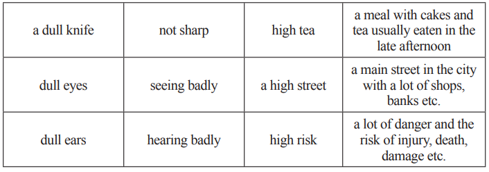 As you see from this table the adjectives dull and high with the different nouns forming new word-groups which are distinguished into separate meanings. In most cases in the semantic development of a word both ways: radial polysemy and chain polysemy are combined.