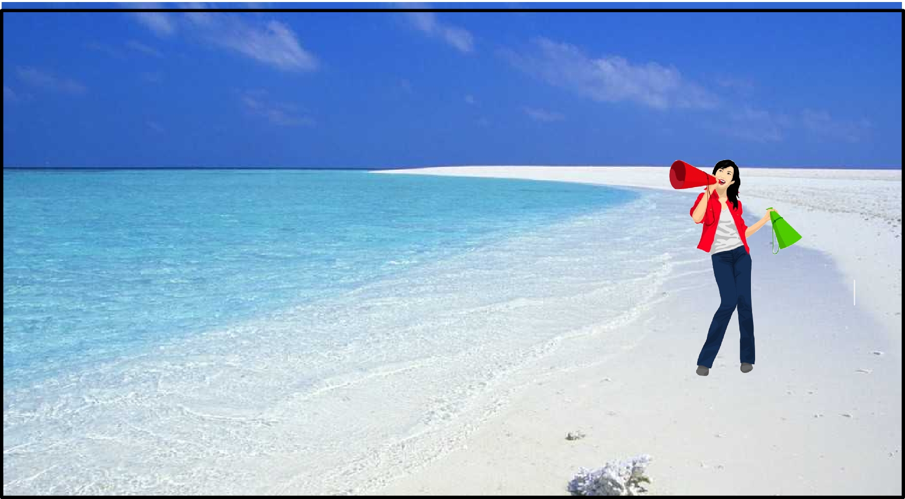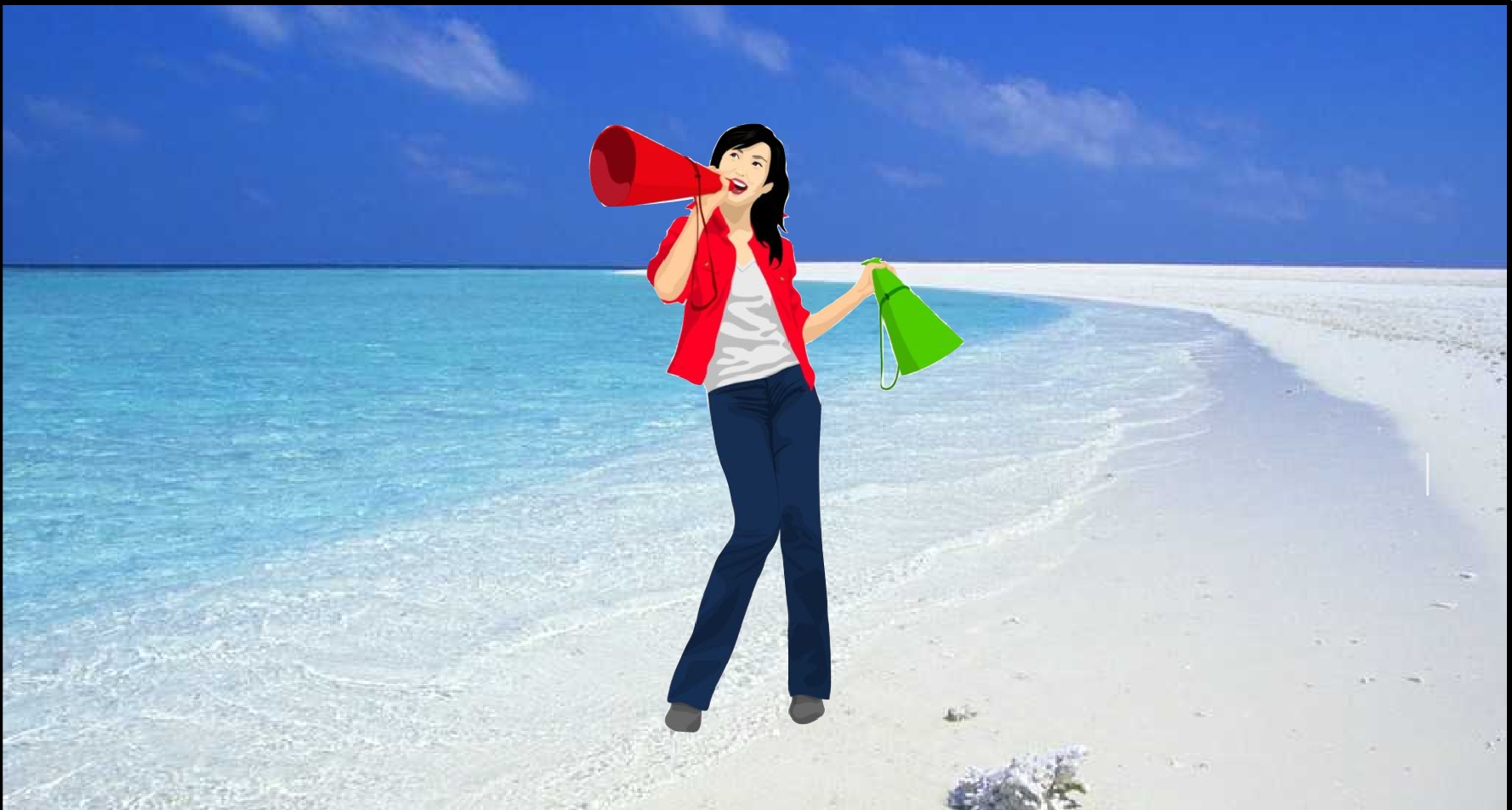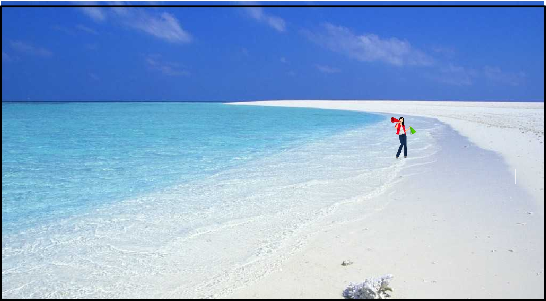 全景跟上面中景相比,已经露出了画面主体的全貌,对画面主体部分的外貌可以做一个全面的了解了,这时候的背景毫无疑问已经占得主导部位,蔚蓝的天空,碧波大海,银白色的沙滩,细波微微,前面几个镜头人们会感到,这个女孩儿在热情的喊话,这个镜头就增加了新的内容,哦,他原来在这样一个好的环境里喊话,心情肯定是很好的,当然这个时候主体部分的情绪,如果表现的十分激烈的话,还是能够从背景那边争得一些主题权的。