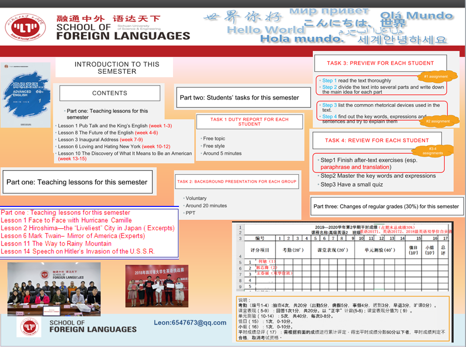 | 三、教学方法与手段 本课程采取线上线下混合式教学的方法,始终以学生和学习为中心,秉承成果导向(Outcome-based Education)教育理念,以功能语言学、语用学等语言学理论为指导,利用网络资源和线上平台,多维度考核学生,充分调动、发挥师生双方积极性,使英语学习成为学生的个性化、主动式、自主式的学习。教师不断思考如何提高学生文学欣赏、语言修辞、写作能力和跨文化传播能力,实现培养学生的知识、能力、价值观引领“三位一体”的教学模式建构,为培养学生讲好中国故事打下扎实基础。 | ||||||||