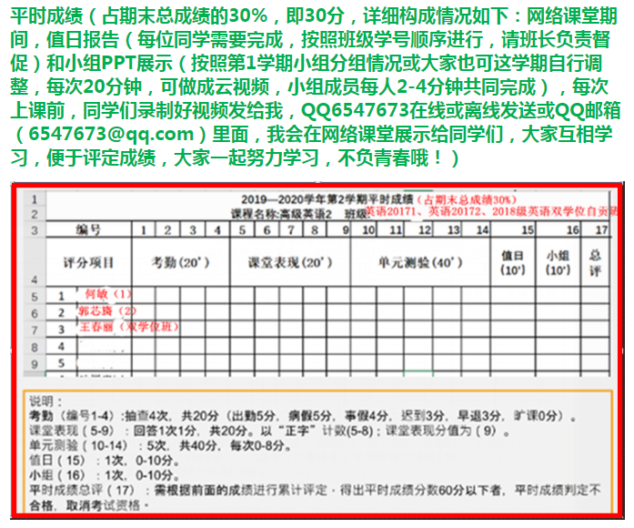 | 六、考核方式与要求 1. 考核方式:建立过程考评与终结考评、知识考试与能力考试、线上测验与线下考评、课程考评与第二课堂考评相结合的考评体系,切实提高课程考试的教学反馈机制和学能、学业成绩评价机制,学生线上线下平时学习情况占30%, 期末考核成绩占70%。 2.期末考试形式:笔试,满分100分。 3.成绩评定:本课程学期考核总成绩为100分,成绩评定按《四川轻化工大学课程考核评定办法》及《高级英语》考试方案执行。学期末考评成绩由两部分组成:平时成绩(30%)和期末考试成绩(70%)。平时成绩包括:出勤(40%),5次线上单元测验30%,课堂PPT、讲解演示(10%),回答问题(10%)),课后作业(10%)。
