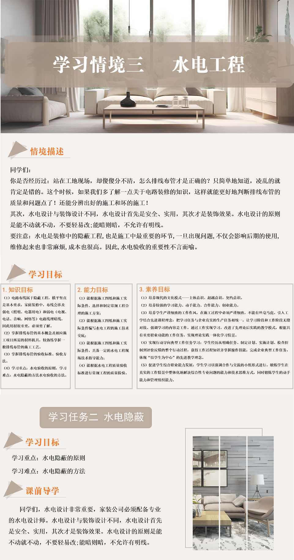 3、业主所要求的效果与完成后的实际使用效果是否一致。由于业主对装修一般不太懂,提出要求时不可能从房子的总体布局来考虑,一些在局部看起来好的要求从总体上考虑就不一定合理。另外,随着新技术和新材料在家庭装修中水电方面的应用,那些在安全、环保、节能方面存在不足的技术和材料逐渐被淘汰,设计师应时刻注意这方面的变化。例如配电系统由原来的三相四线制改为三相五线制、节能灯具在家装中应广泛采用、建设部推广应用的节能环保型给排水材料和卫生洁具等。