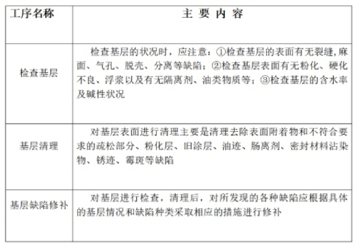 墙面基层处理分基层检查、基层清理和基层修补等工序,见下表。
