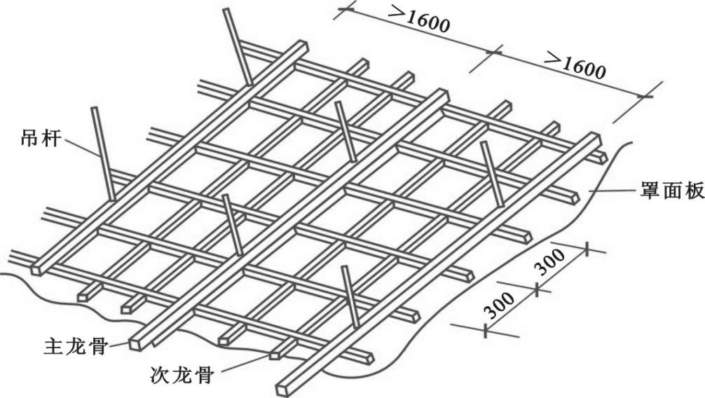 吊顶木龙骨架是由木制的大、小龙骨拼装而成的吊顶造型骨架。当吊顶为单层龙骨时不设大龙骨,而用小龙骨组成方格骨架,用吊挂杆直接吊在结构层下部。