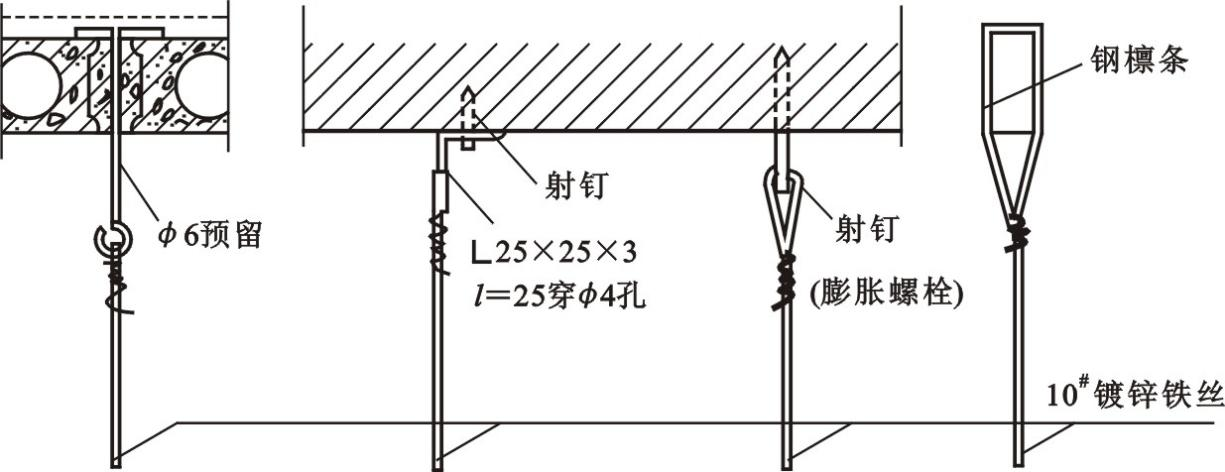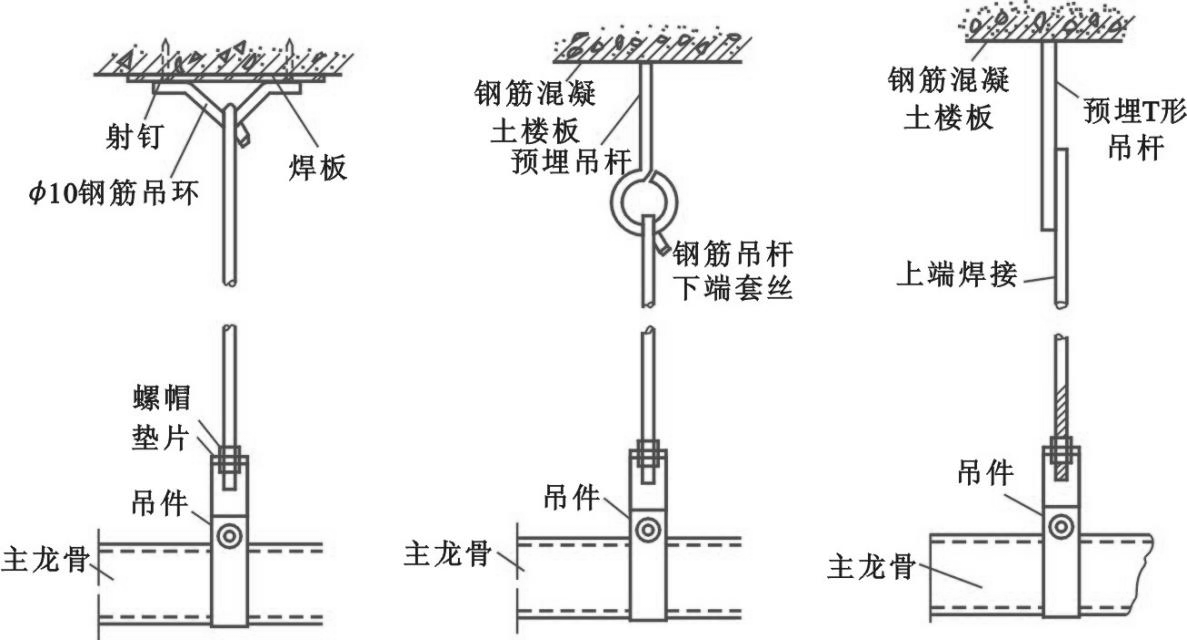 吊顶悬挂系统的形式较多,可视吊顶荷载要求及龙骨种类而定,图5.1为吊顶龙骨悬挂结构形式示例,其与结构层的吊点固定方式通常分上人型吊顶吊点和不上人型吊顶吊点两类,如图5.2、图5.3所示。