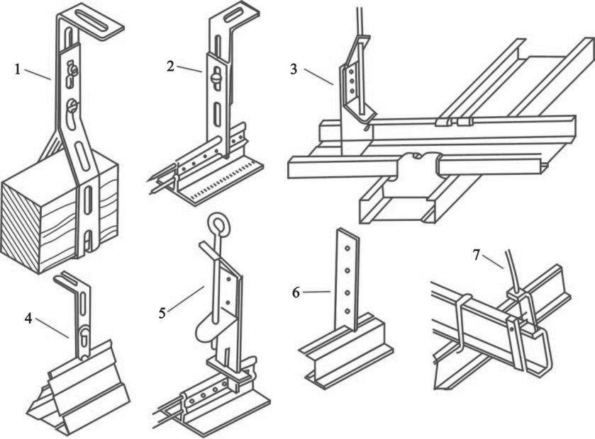 5—伸缩吊杆与T形龙骨;6—扁铁吊杆与H形龙骨;