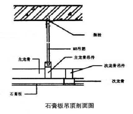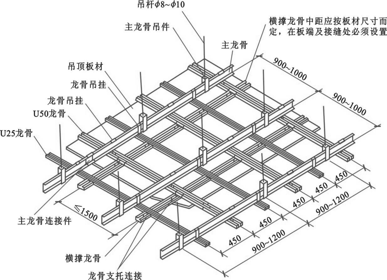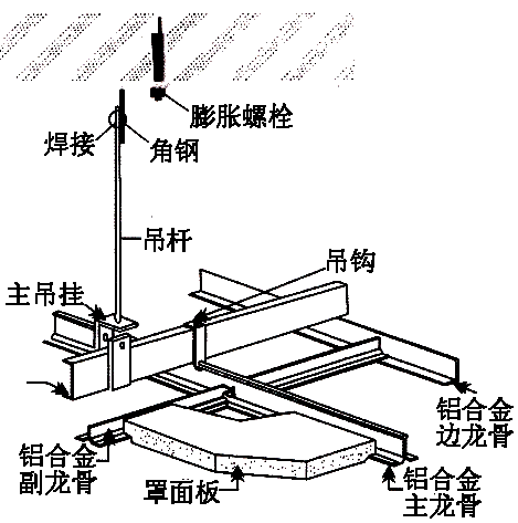 吊顶顶棚主要是由悬挂系统、龙骨架、饰面层及其相配套的连接件和配件组成,其构造如图所示。