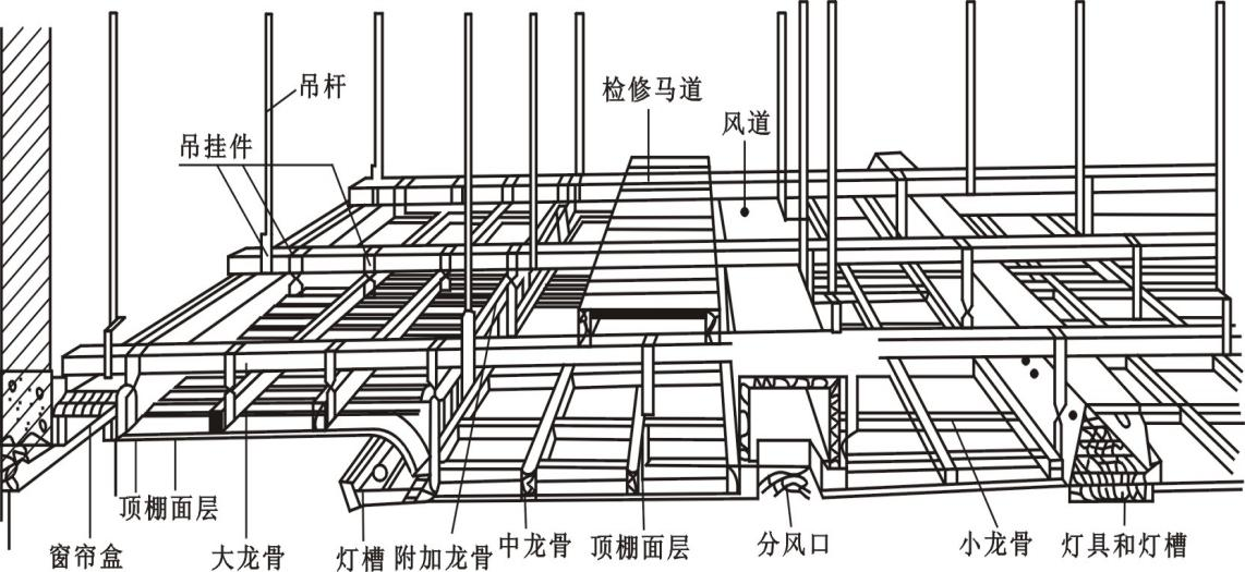 吊顶悬挂系统包括吊杆(吊筋)、龙骨吊挂件,通过它们将吊顶的自重及其附加荷载传递给建筑物结构层。