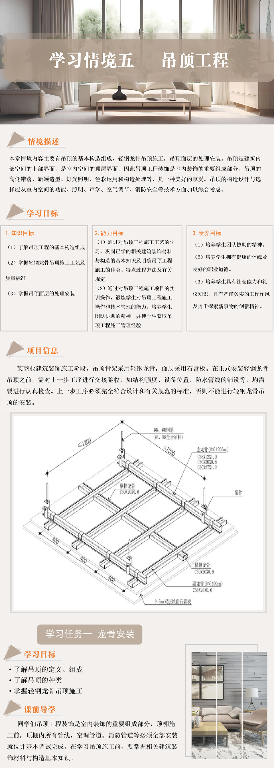 通过课堂学习结合课下实训使学生达到熟练掌握明龙骨吊顶工程项目的技术交底、材料制备、施工操作和质量验收整个运行过程的施工操作要点和国家相应的规范要求,提高学生进行明龙骨吊顶工程技术管理的综合能力。