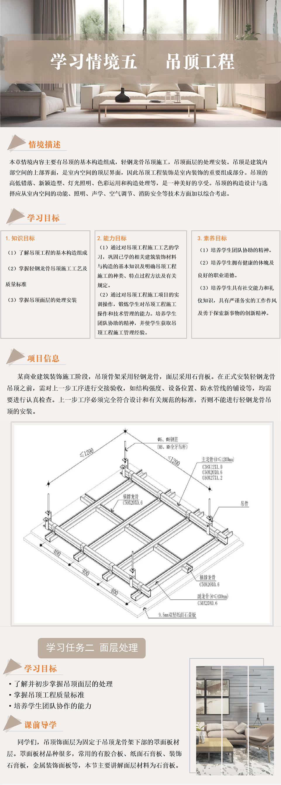 (2)分组制订计划与实施,培养学生团队协作的能力,并获取明龙骨吊顶工程施工管理经验。