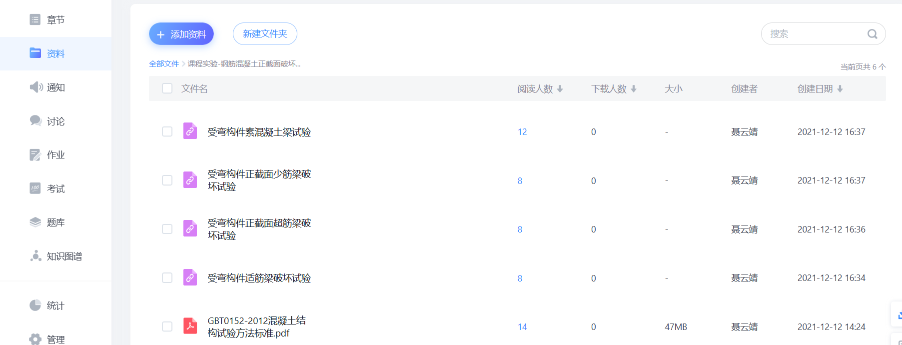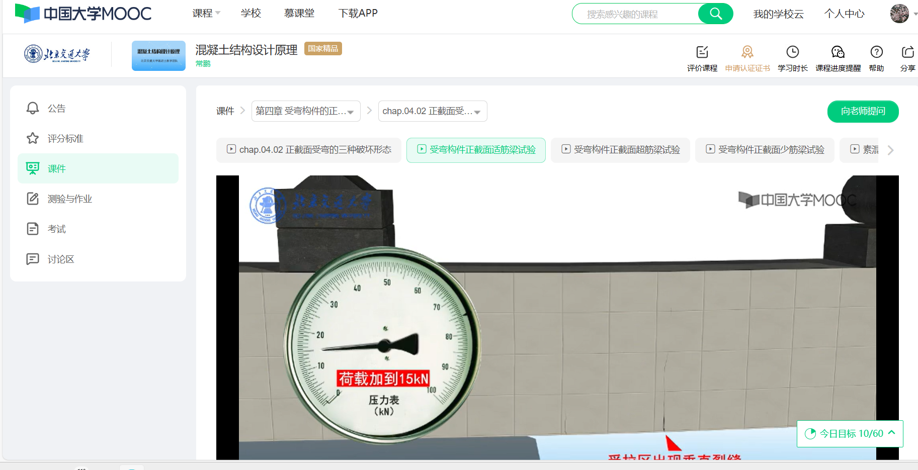 在学习通中的资料里观看视频:资料/课程实验-钢筋混凝土正截面破坏实验(需要大家加入中国大学慕课进行视频观看学习)