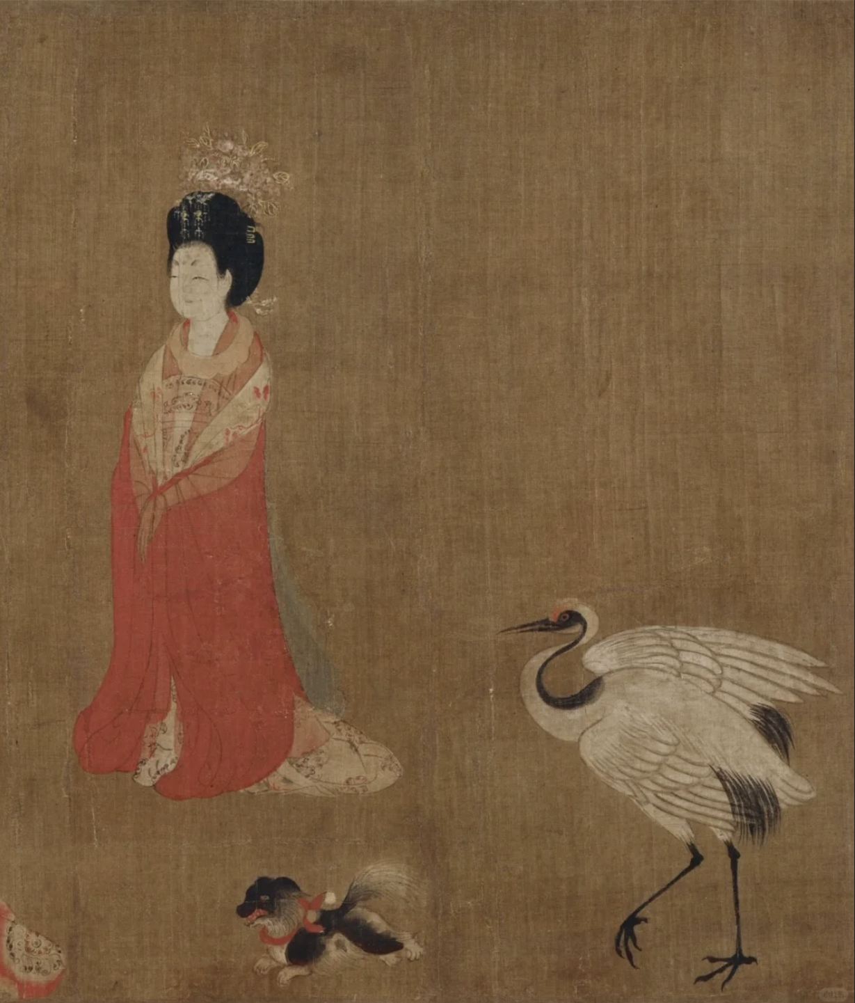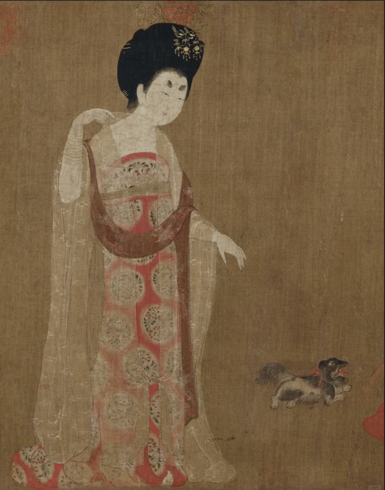 《簪花仕女图》绢本设色,纵46厘米,横180厘米,现藏辽宁省博物馆,是典型的唐代仕女画作品,也是唐代现实主义风格绘画的代表作。此卷作品用工笔重彩描绘了簪花仕女五人,执扇侍女一人。乍看相似,实则各有特点,不仅是服装、体态不同,连妆容眉目、表情也不相同。人物线条圆润有力,色彩也是浓郁但不艳俗,颇具唐朝时期盛世之景。画作不设背景,以工笔重彩绘仕女五人,女侍一人,另有小狗、白鹤及辛夷花点缀其间。 全图六个人物的主次、远近安排巧妙,景物衬托少而精。两只小狗、一只白鹤、一株辛黄花使原本显得孤立的人物产生了左右呼应、前后联系的关系。半罩半露的透明织衫,使人物形象显得丰腴而华贵。而用笔和线条却细劲有神,流动多姿。浓丽的设色,头发的钩染、面部的晕色、衣着的装饰,都极尽工巧之能事,较好地表现了贵族妇女的细腻柔嫩的肌肤和丝织物的纹饰。此图是周昉贵族人物画风格的代表。同时也体现出贵族仕女养尊处优、无所事事、游戏于花蝶鹤犬之间的生活情态。此卷又是全世界范围内专家学者唯一认定的唐代仕女画传世孤本。除了唯一性之外,其作品的艺术价值也很高,是典型的唐代仕女画标本型作品,是能代表唐代现实主义风格的绘画作品。