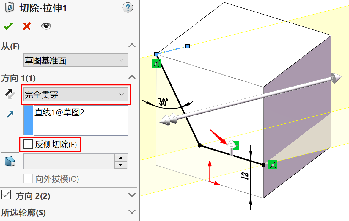 l 拉伸切除 :切除是从零件或装配体上移除材料的特征,常用封闭草图实现切除效果。