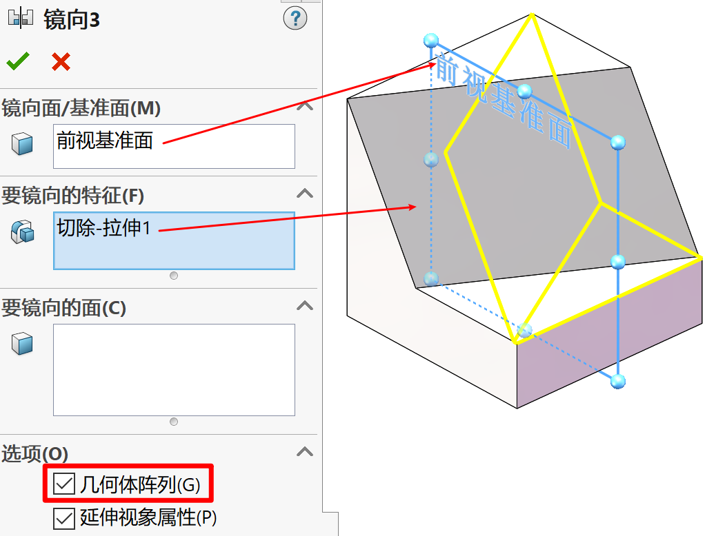 l 镜向实体 :以镜像平面上预先存在的 2D 草图实体,然后选择镜向所绕实体。当您生成镜向实体时,SolidWorks 软件会在每一对相应的草图点(镜向直线的端点、圆弧的圆心等等)之间应用一对称关系。如果您更改被镜向的实体,则其镜向图像也会随之更改。