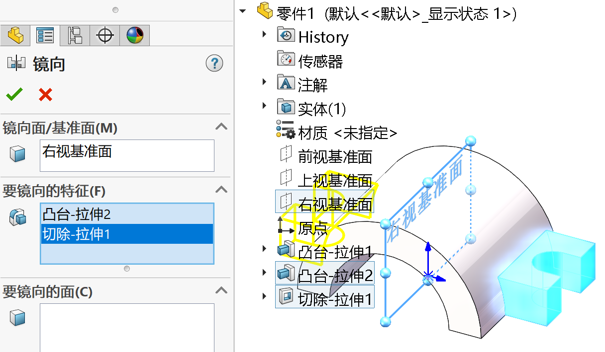 l 镜向:沿面或基准面镜向,生成一个特征(或多个特征)的复制。您可选择特征或您可选择构成特征的面(在零件中,您可镜像面、特征和实体;在装配体中,您可镜像装配体特征)。如果您修改原始特征(源特征),则镜向的复制也将更新以反映其变更。