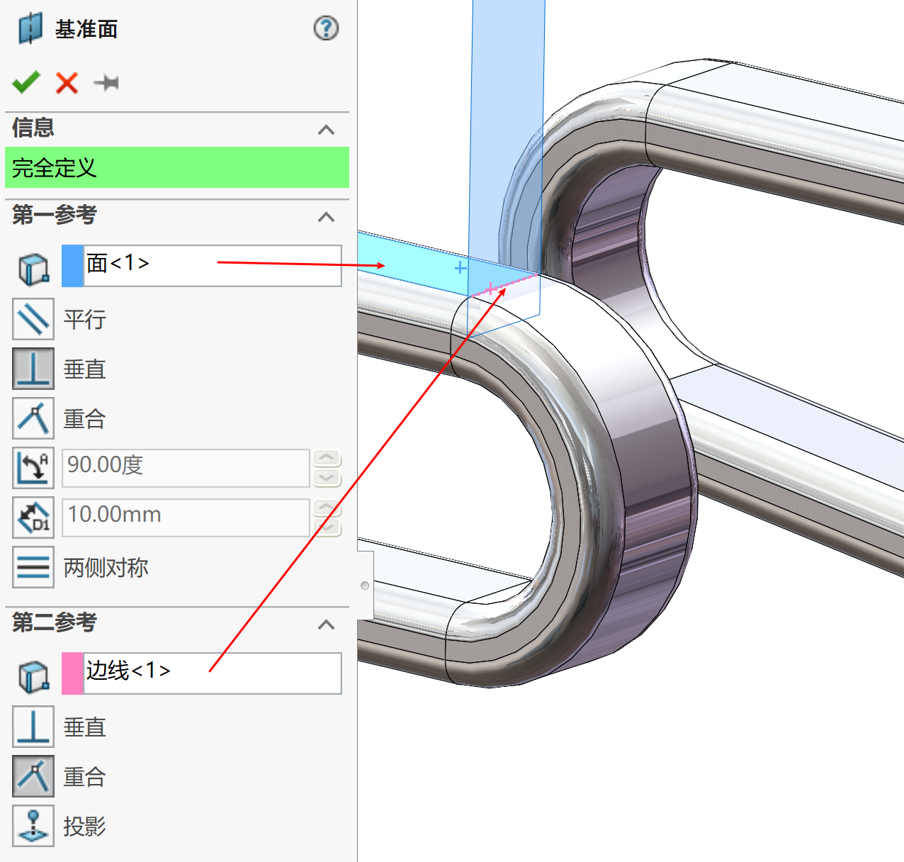 l 基准面:可以在零件或装配体文档中生成基准面。SolidWorks 提供前视、上视和右视平面作为默认值。方向(前视、上视、右视等)与这些平面相关。基准面用来绘制草图和为特征生成几何体。除了默认的基准面外,您可生成参考基准面,您可在平面模型面上打开草图(系统会根据所选的要素,自动推荐最适合的基准面生成方式,操作时,除了数值外,其他一般无需干预)。