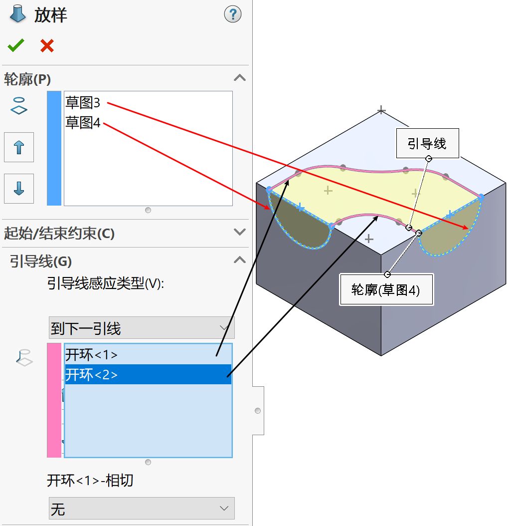 l 放样凸台/基体:放样通过在轮廓之间进行过渡生成特征。放样可以是基体、凸台、切除或曲面。您可以使用两个或多个轮廓生成放样。仅第一个或最后一个轮廓可以是点,也可以这两个轮廓均为点。单一 3D 草图中可以包含所有草图实体(包括引导线和轮廓)。