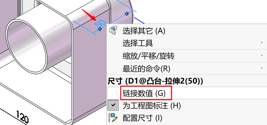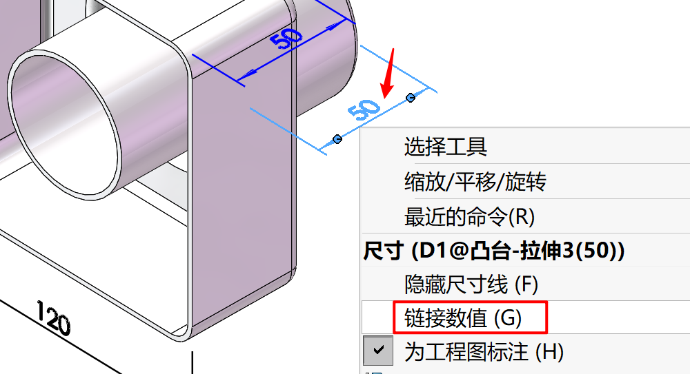 l 链接数值:使用链接数值(也称“共享数值”或“链接尺寸”)链接两个或多个尺寸,无需使用关系式或几何关系。当尺寸用这种方式链接起来后,该组中任何成员都可以当成驱动尺寸来使用。改变链接数值中的任意一个数值都会改变与其链接的所有其它数值。您所指定的变量名称成为链接的尺寸的名称。