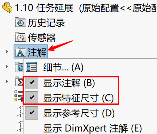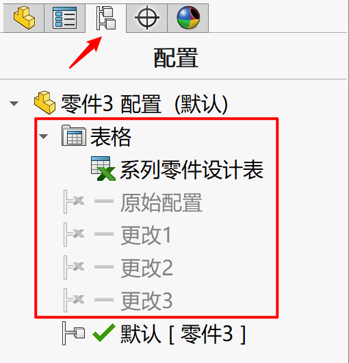配置属性,包括材料明细表中的零件编号、派生的配置、方程式、草图几何关系、备注、材料以及自定义属性。