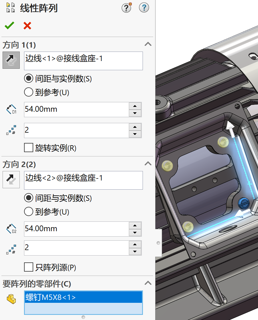 4、插入螺钉并添加配合+线性零部件阵列