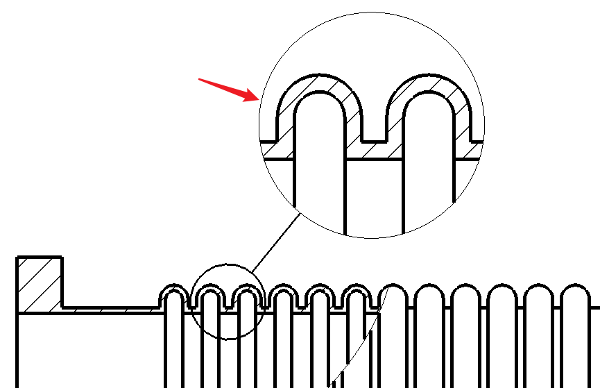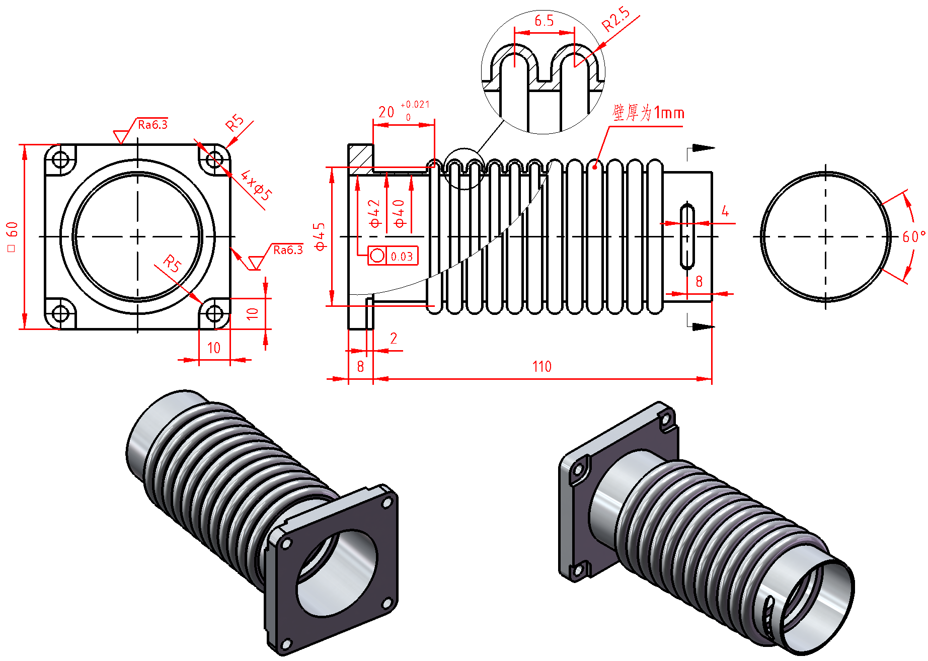 l 局部视图:在工程图中生成一个局部视图来显示一个视图的某个部分(通常是以放大比例显示)。此局部视图可以是正交视图、空间(等轴测)视图、剖面视图、裁剪视图、爆炸装配体视图、或另一局部视图。放大的部分使用草图(通常是圆或其它闭合的轮廓)进行闭合。