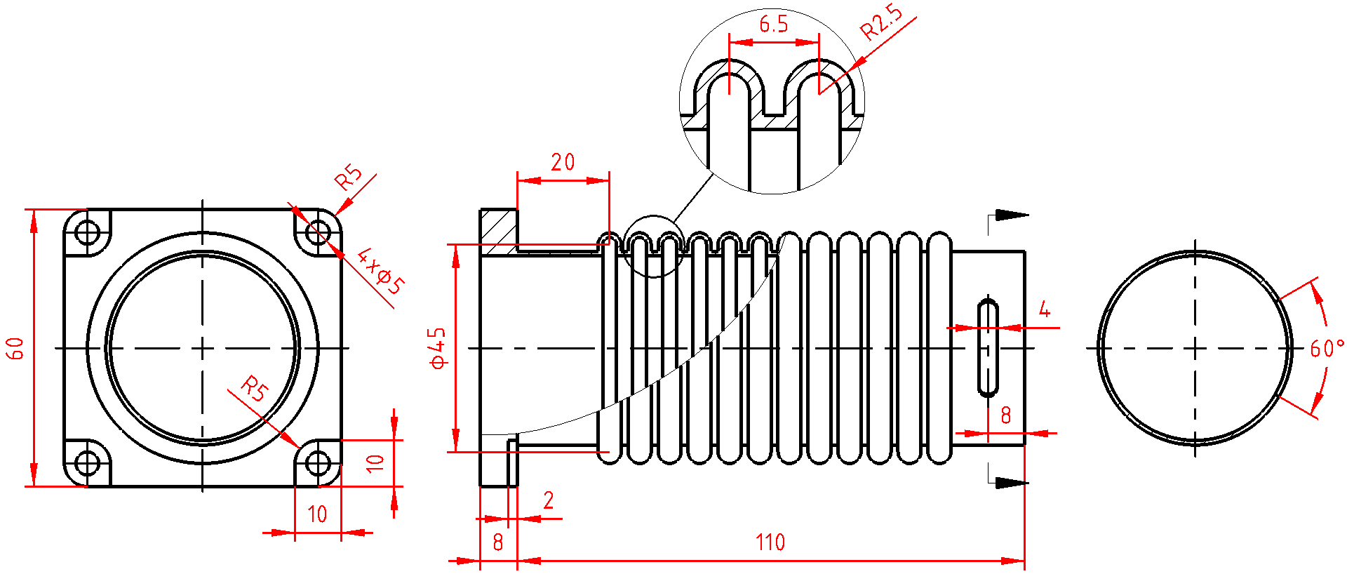 l 辅助视图:辅助视图类似于投影视图,但它是垂直于现有视图中参考边线的展开视图。