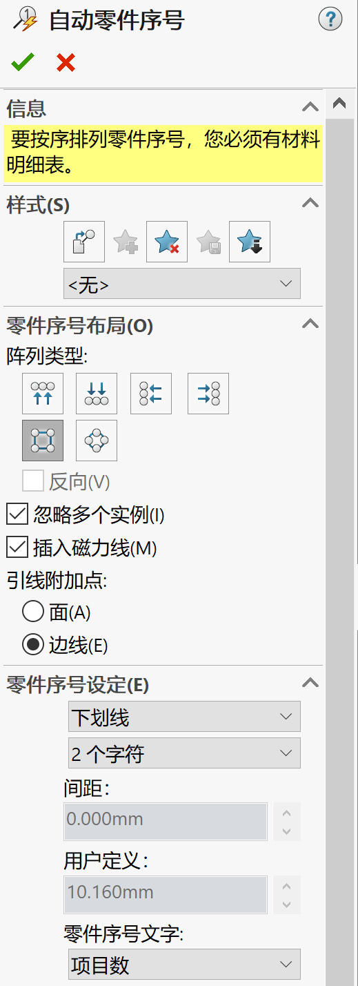 l 自动零件序号:零件序号用来将装配体中的零件以注释的方式标注出项目符号。可使用自动零件序号自动在一个或多个工程图视图中插入一组零件序号,零件序号会插入到适当的视图中,不会重复。