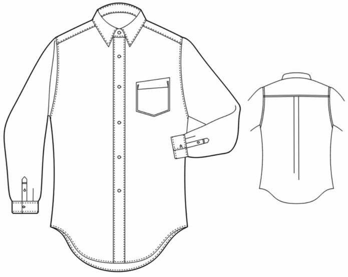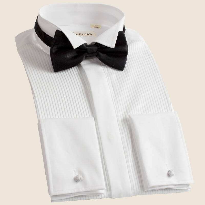 胸前打褶,领口可做成立领、双翼领,或者其他适合搭配西装的领型,袖口为法式双叠袖口,这种袖口延续了Tuxedo(塔士多)礼服衬衫的特色,是分辨场合正式等级、穿着者身份的重要象征。礼服衬衫是在重大的礼仪场合穿着的衬衫,与燕尾服或晨礼服配合穿着,以平挺、华贵的外观,显示出男士优雅高贵的绅士风度。礼服衬衫保持了欧洲古典风格。略收腰合体,前胸与门襟有坚胸式或褶裥式的装饰,以小花边等传统工艺进行装饰。领子的尺寸贴切适体,常使用可脱卸的翼领,使衣领显得挺括贴体。袖克夫比外穿的礼服袖子略长1-2cm,并使用装饰纽扣点缀。礼服衬衫多以优质白色棉或丝绸制作。