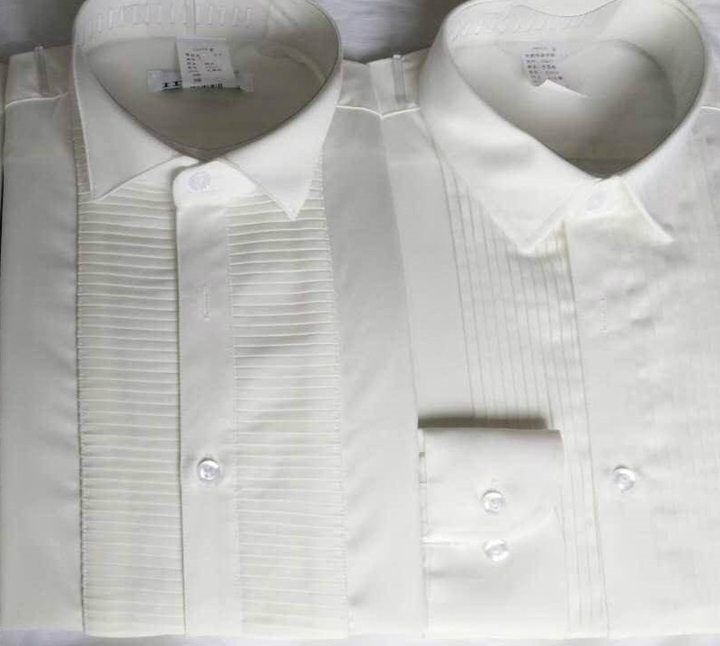 (2)礼服衬衫:搭配男子礼服穿用,白色,款式为坚胸(前胸U形分割),冀领或剑领,双层袖头,适体造型。