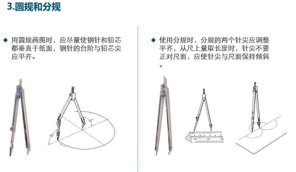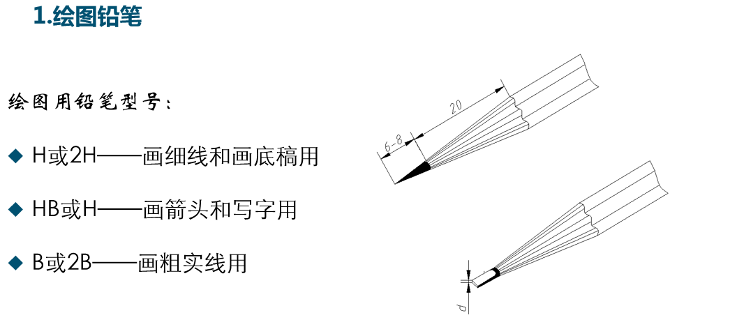 | 学习目标 | 知识目标 | 熟悉常用机械制图绘图工具的使用方法和特点,如丁字尺、绘图板、圆规、铅笔等。 |
