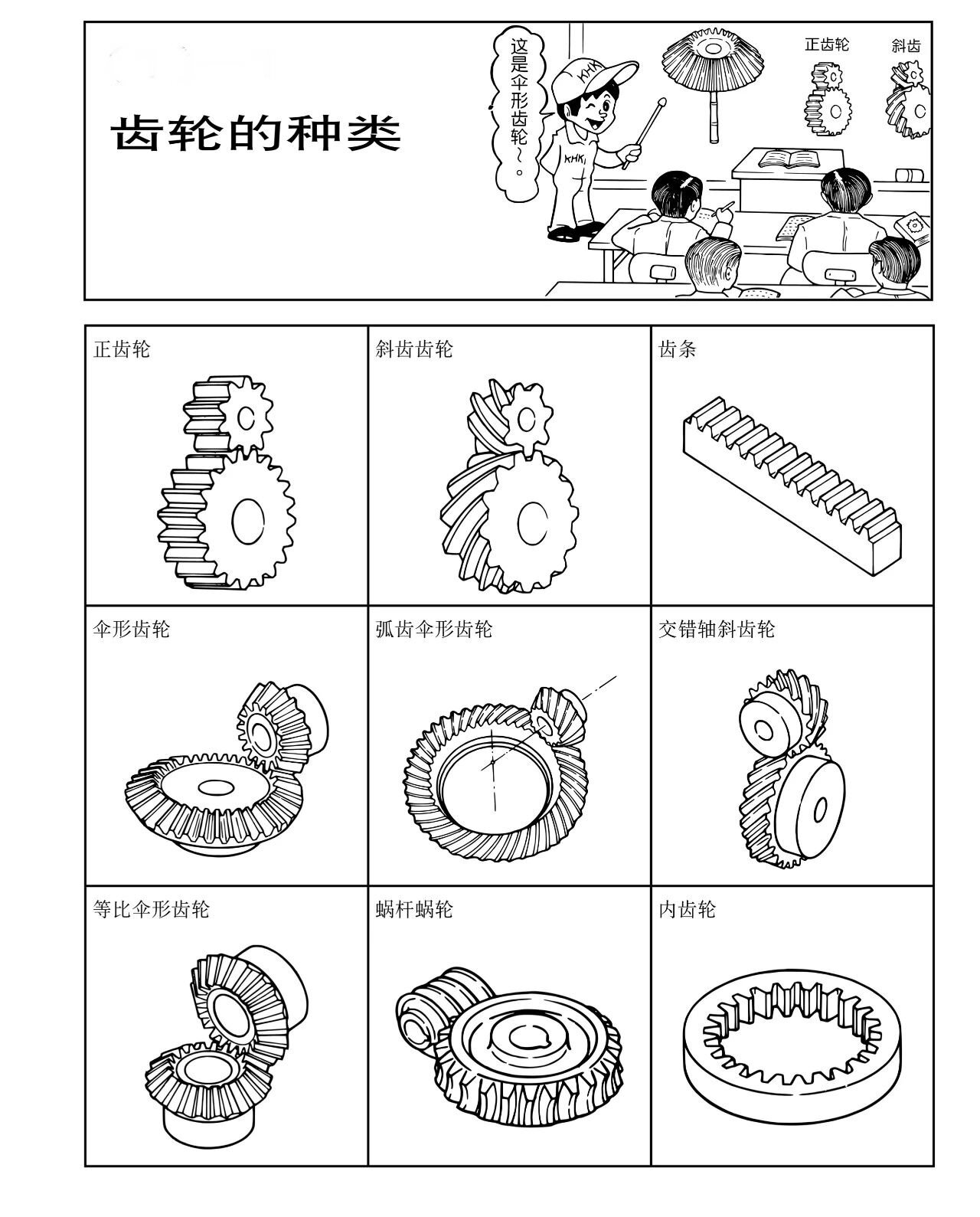 | 课前预习 | 齿轮是机械传动中应用最广的一种传动零件,它不仅可以用来传递动力,还能用来改变轴的转速和旋转方向。齿轮的齿形部分是标准化的结构。