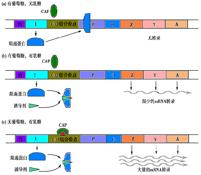 (1)有葡萄糖无乳糖存在时,阻遏蛋白结合在操纵基因上,阻止结构基因的转录,此时基因关闭不表达。