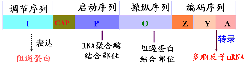 操纵序列:阻遏蛋白的结合位点,当操纵序列与阻遏蛋白结合时,会阻碍RNA聚合酶与启动序列的结合,或是RNA聚合酶不能沿DNA向前移动,阻碍转录。