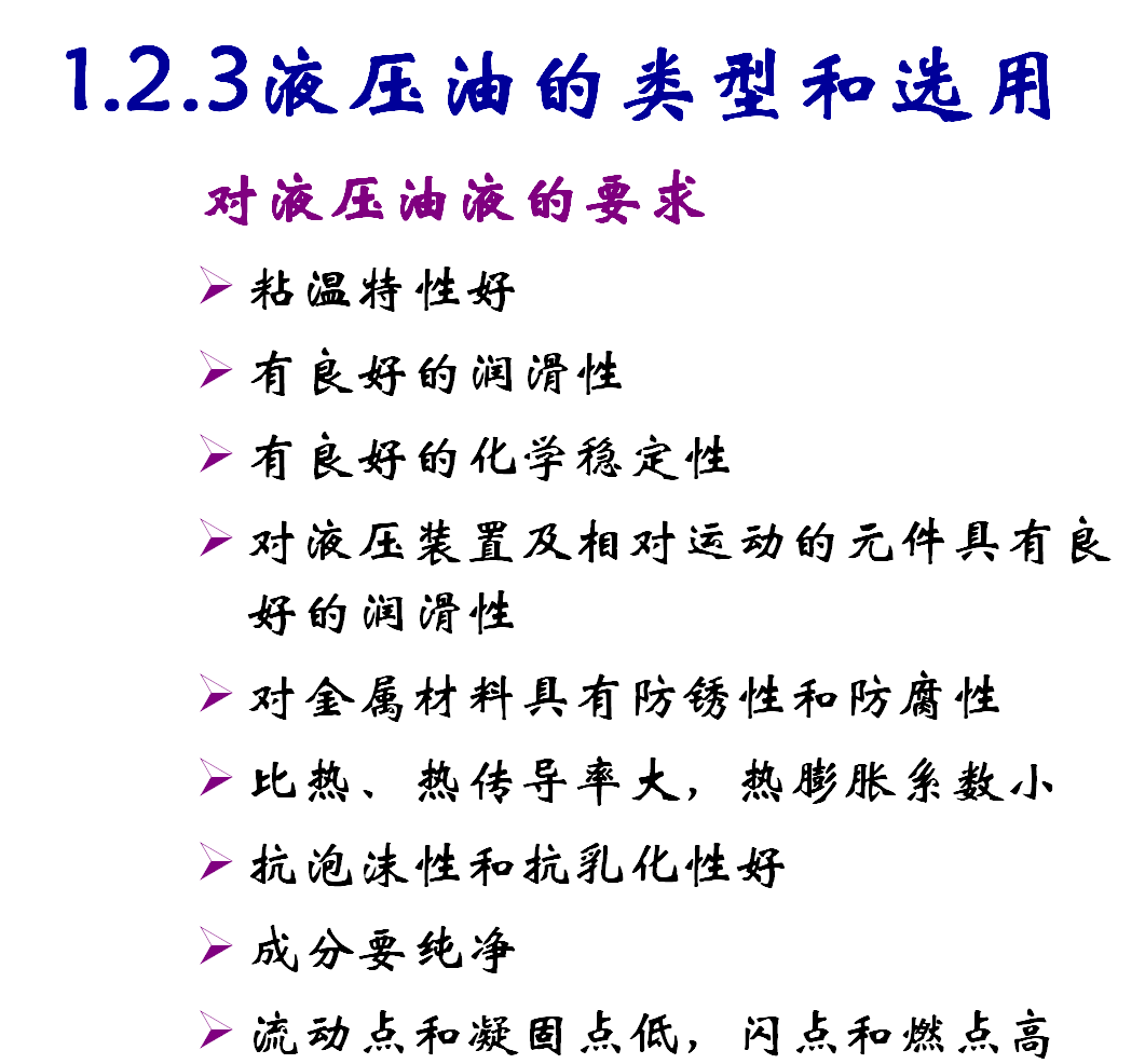 液压系统是以液压油为工作介质来传递动力和信号的,因此油液质量的优劣,尤其是力学性能对液压系统工作的影响很大。所以,我们在研究液压系统之前,必须对所用的液压油及其性能进行较深入的了解,以便进一步理解液压传动的基本原理。