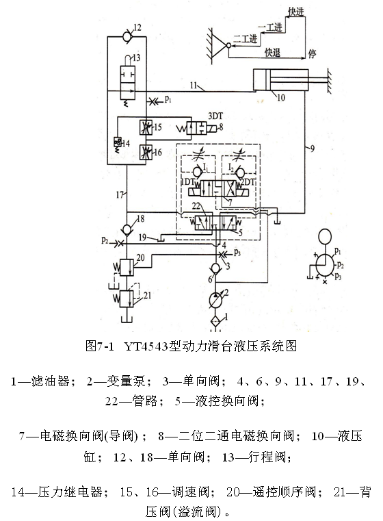 图7-1所示为YT4543 型动力滑台的液压系统,它是采用限压式变量泵、调速阀组串联在进油路上的容积节流调速系统;用电液换向阀实现系统主油路的换向;利用行程阀实现快进和工进的速度转换;快进时采用了差动快速回路;工进速度由调速阀控制。这个系统可实现多种自动工作循环,如快进一工进一停顿(死挡铁停留)一快退一原位停止;快进一一工进一二工进一停顿(死挡铁停留)一快退一原位停止等。工作于哪种自动工作循环状态是由电磁换向阀的电磁铁、行程阀的动作顺序决定的。